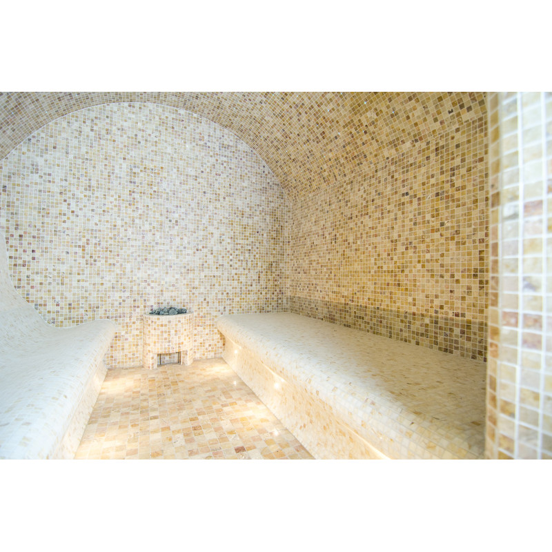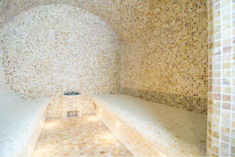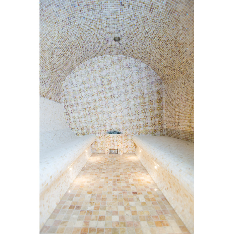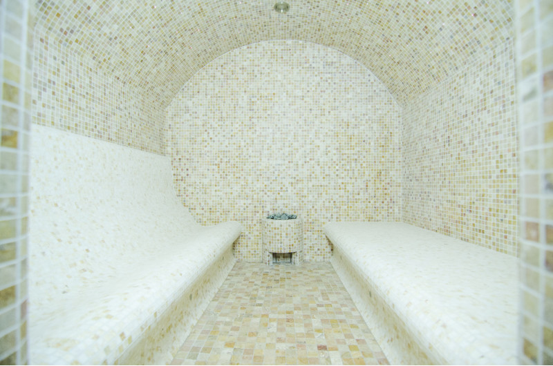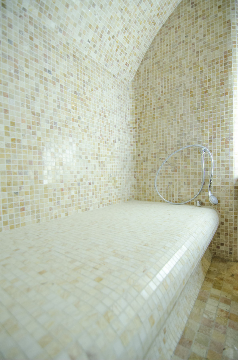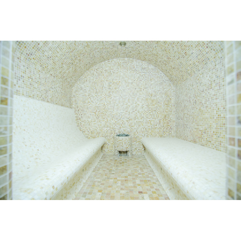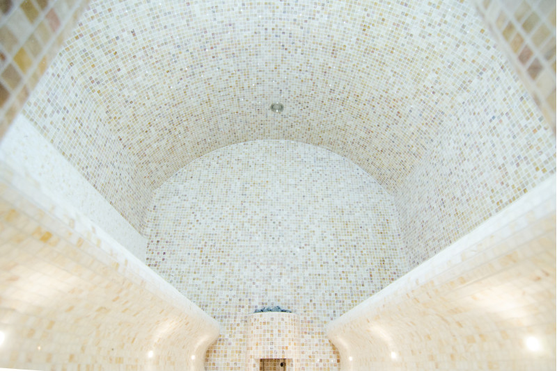Acabado: toda la sala de sauna y los bancos están decorados con mosaicos.