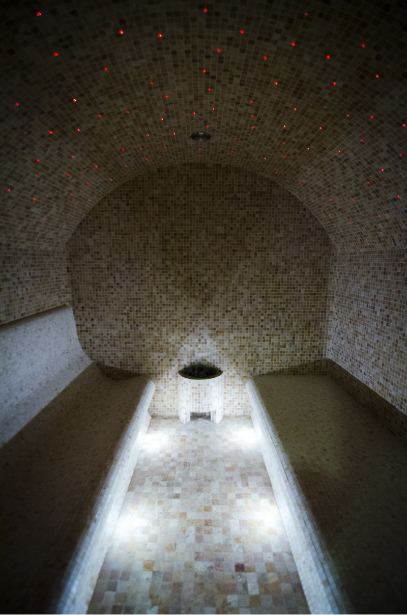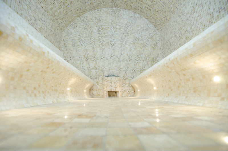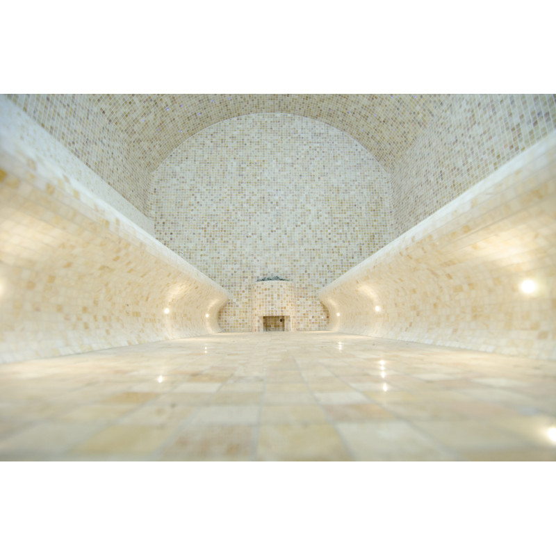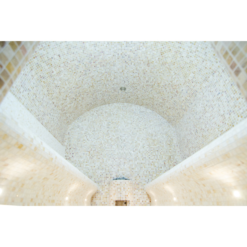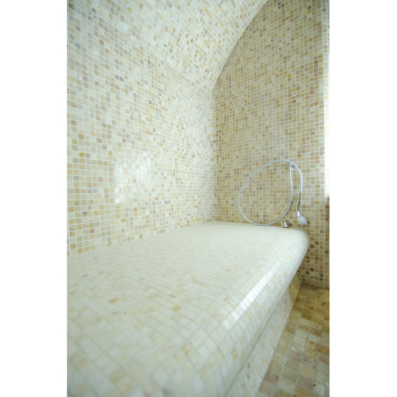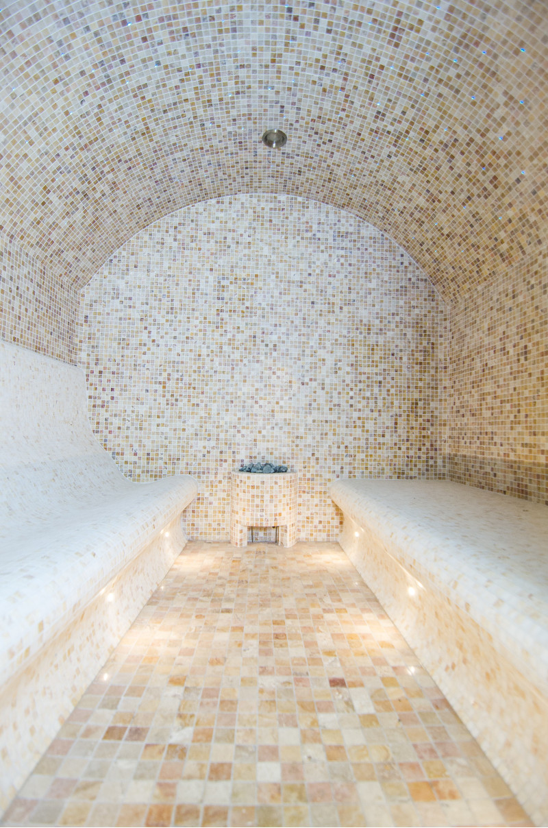 Acabado: toda la sala de sauna y los bancos están decorados con mosaicos.
