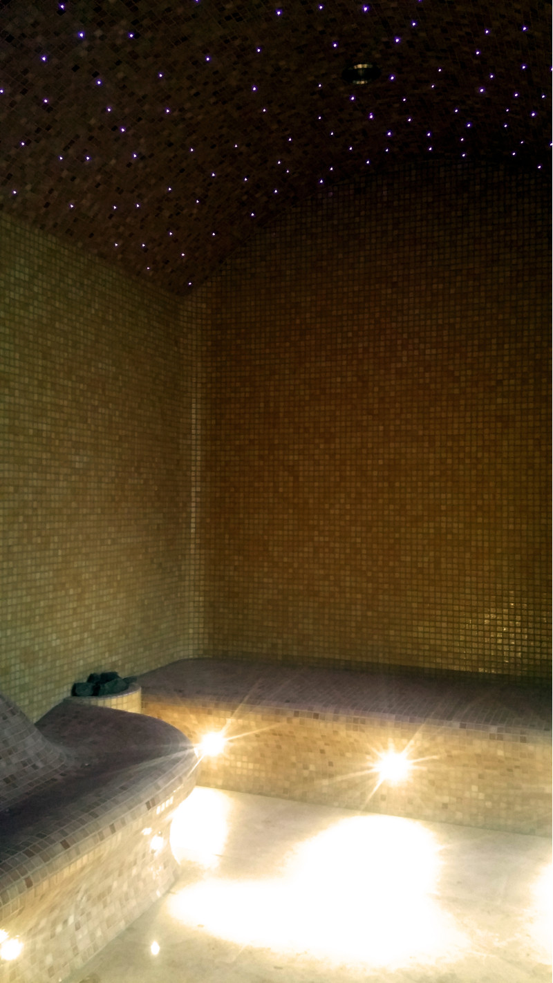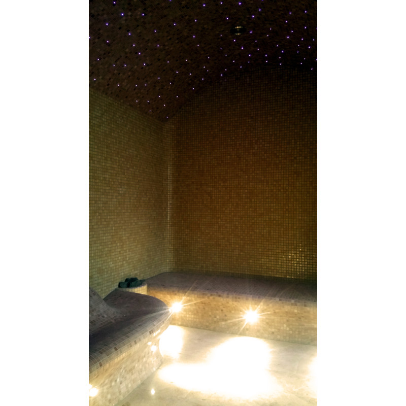 Sistema de iluminación de fibra óptica para el techo - "cielo estrellado". Debajo de los bancos, se proporciona iluminación LED para iluminar el suelo.