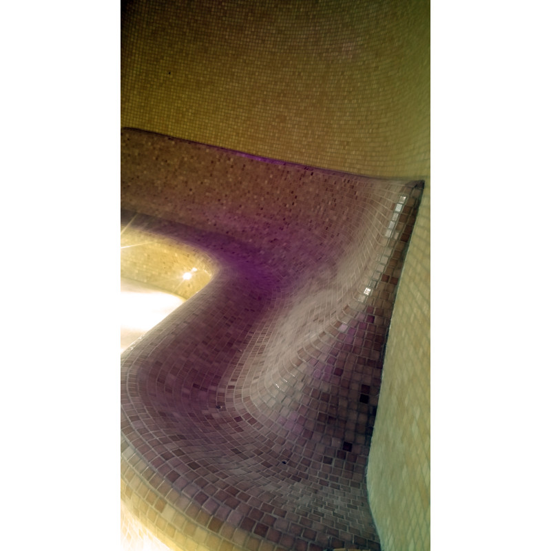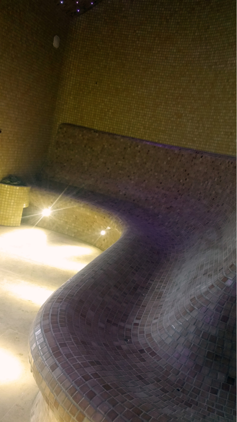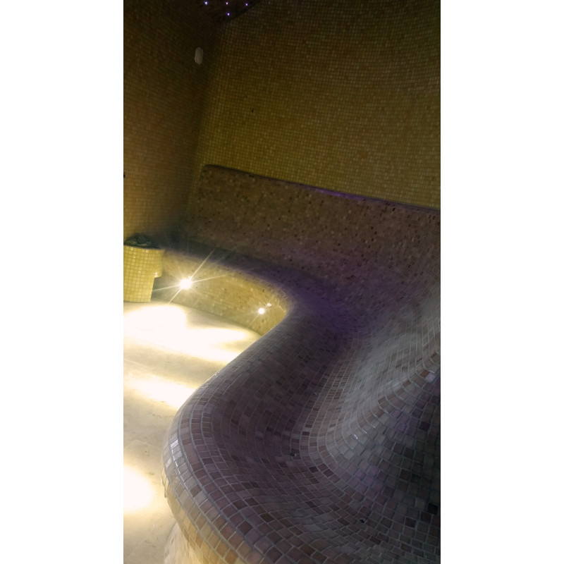 Equipado con bancos curvos con posiciones para sentarse y acostarse, para descansar cómodamente y bañarse en la sauna. Los bancos se vacían para evitar que el sudor y la humedad se acumulen en ellos.