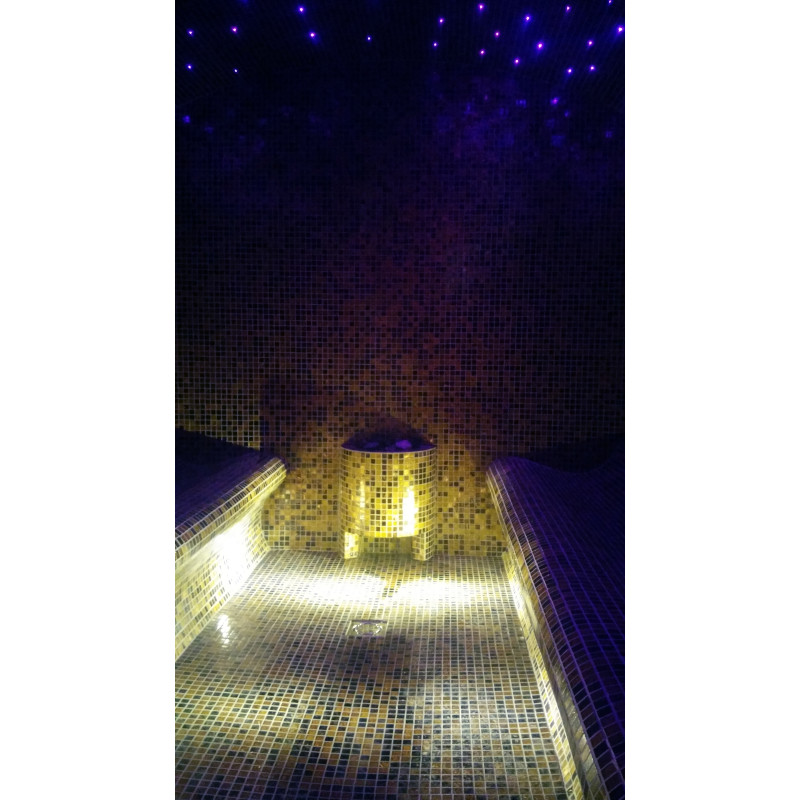 Sistema de iluminación de fibra óptica para el techo - "cielo estrellado". La iluminación de fibra óptica es una solución duradera, versátil, económica y sencilla. Gracias a él, puedes extraer las opciones de iluminación más impresionantes. Debajo de los bancos - iluminación adaptada para la sauna de vapor para iluminar el suelo.
