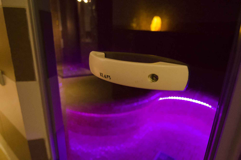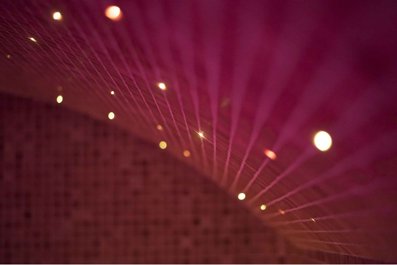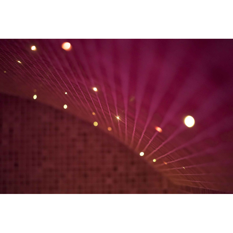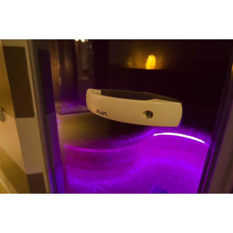 Sistema de iluminación: el techo está iluminado con un sistema de iluminación de fibra óptica "Starry Sky". La iluminación de fibra óptica es una solución duradera, versátil, económica y sencilla. Gracias a él, puedes extraer las opciones de iluminación más impresionantes. El "cielo estrellado" crea un ambiente acogedor y complementa a la perfección la experiencia de calentarse en la sauna. Debajo de los bancos, hay iluminación de colores para iluminar el suelo. Los colores se pueden cambiar.