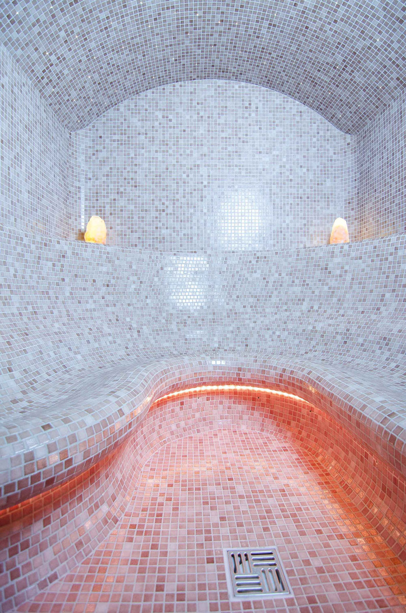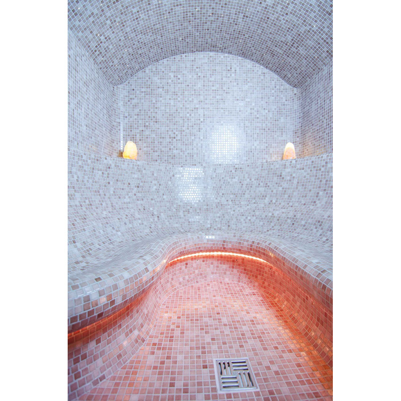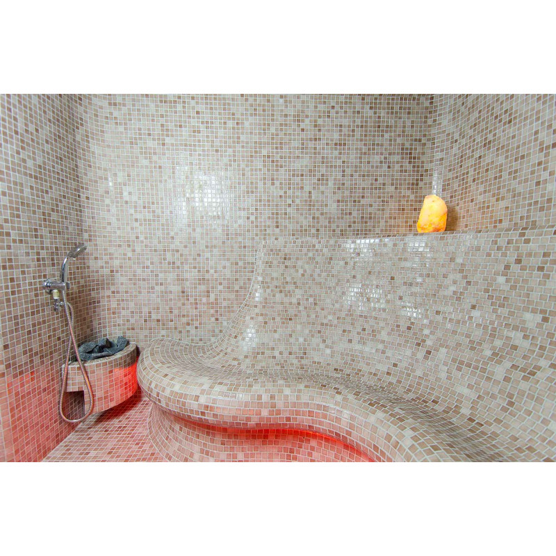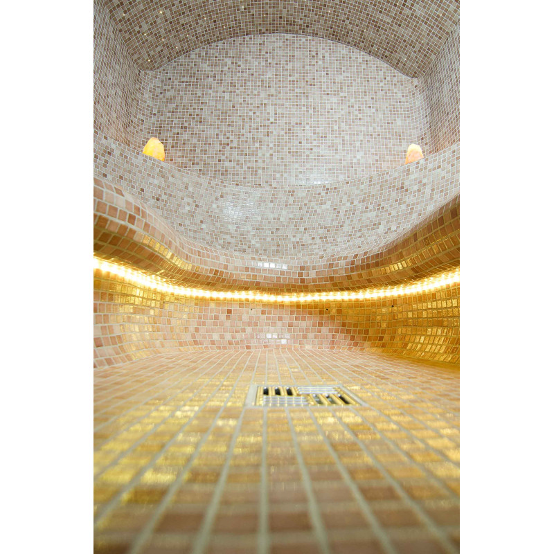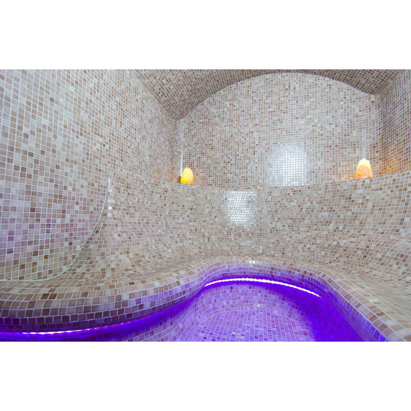 Acabado: los suelos, las paredes, los techos y los bancos de la sauna están decorados con pequeños mosaicos de vidrio triturado.