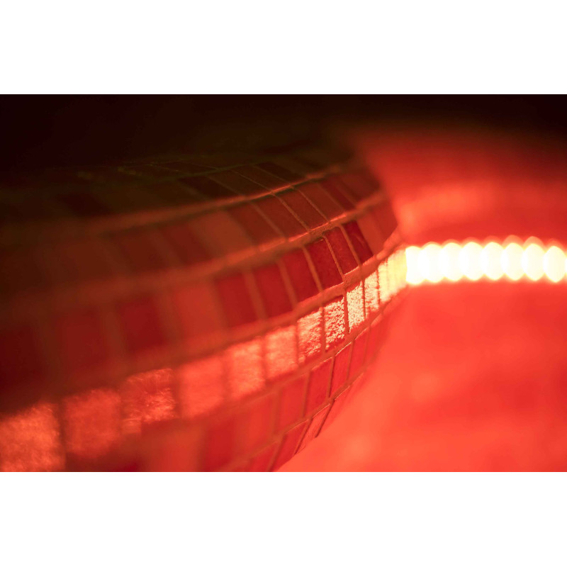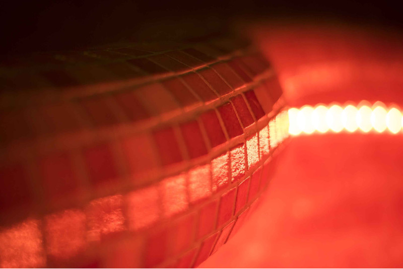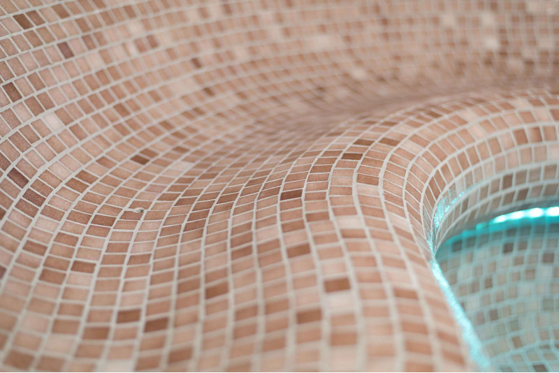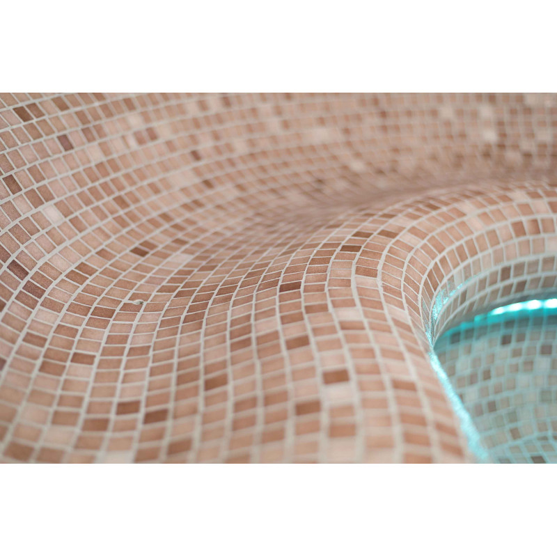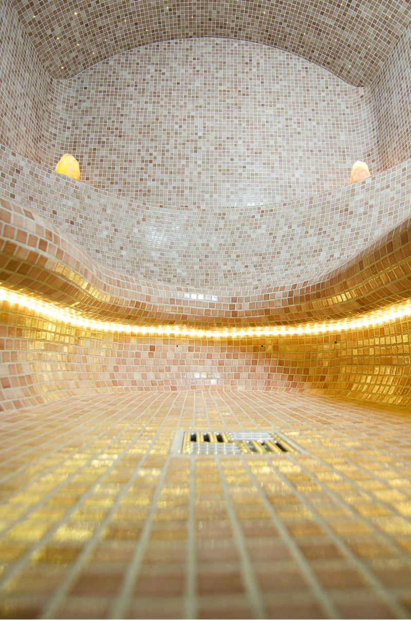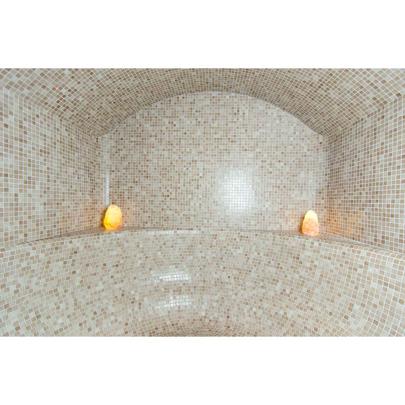 Acabado: los suelos, las paredes, los techos y los bancos de la sauna están decorados con pequeños mosaicos de vidrio triturado.