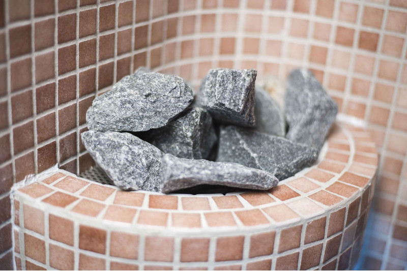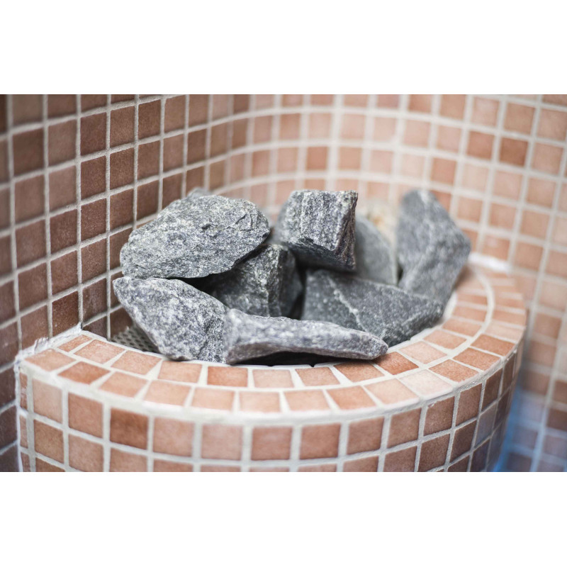 La sauna está equipada con un jarrón de vapor, que realiza la función de una tubería de protección contra el vapor, a través del cual el vapor ingresa a la sauna. Decorado con piedras diabasas de olivino.