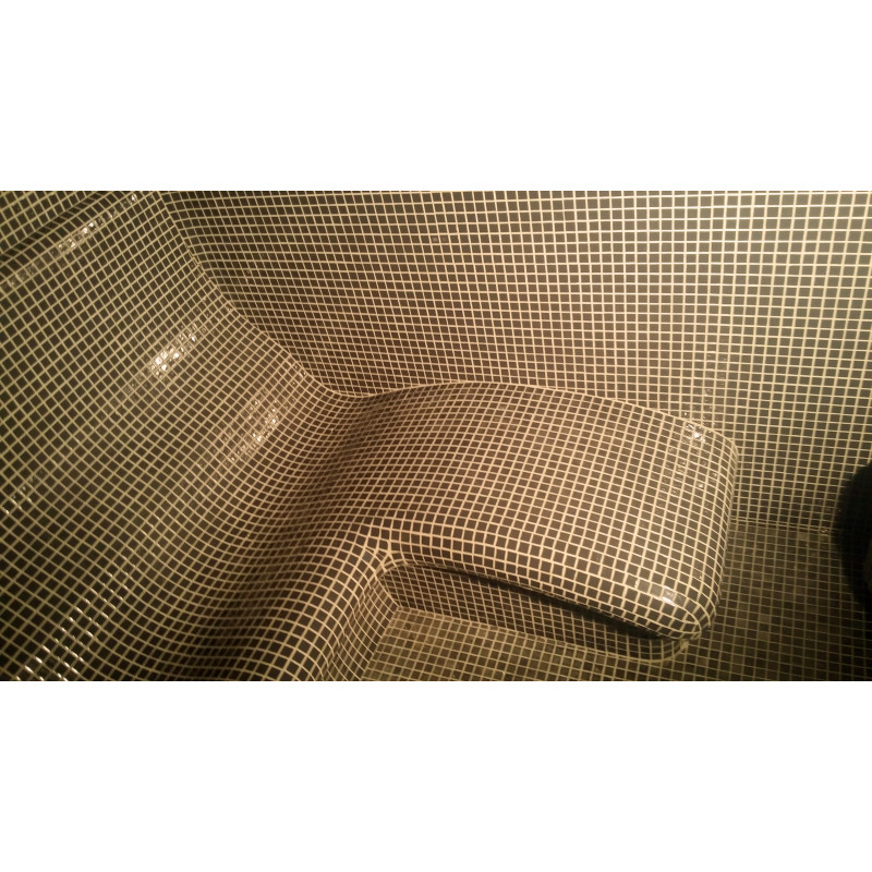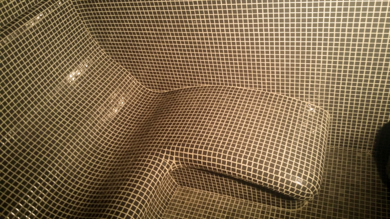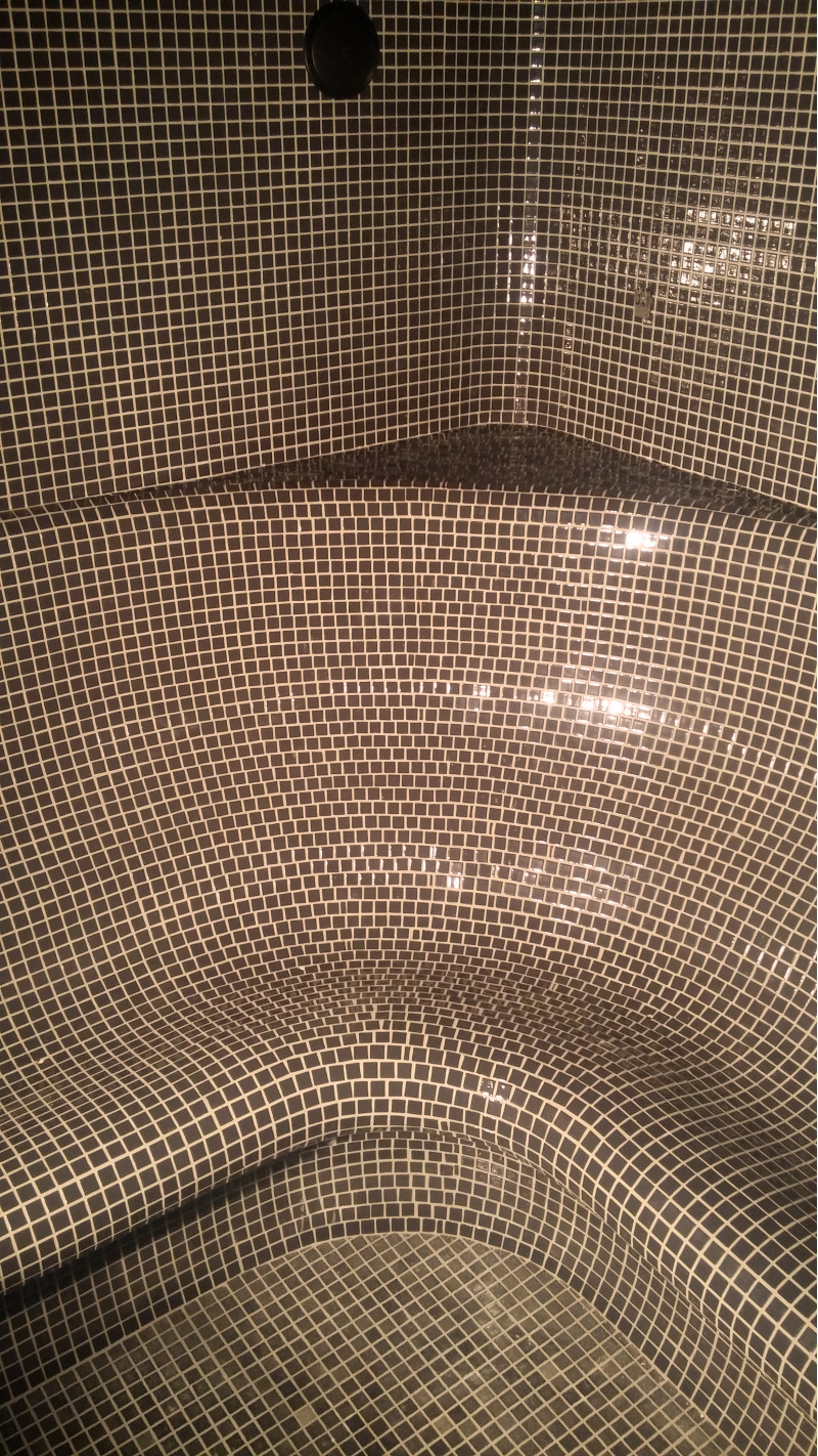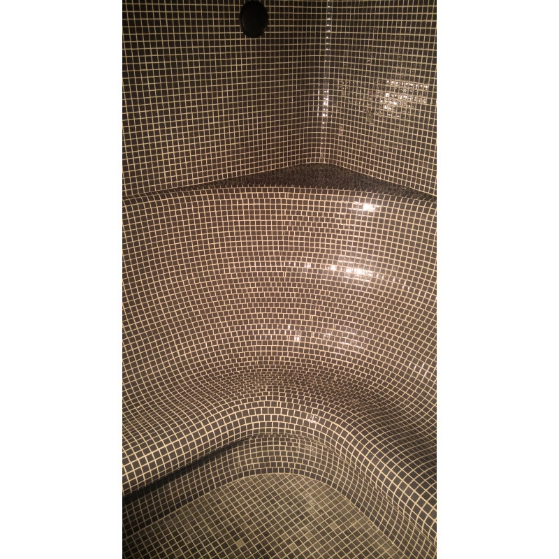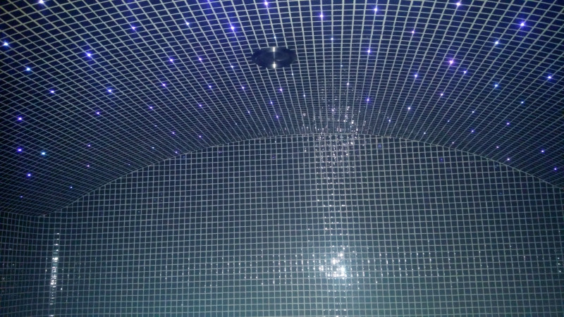 Acabado: toda la sauna está decorada con mosaicos de vidrio triturado.