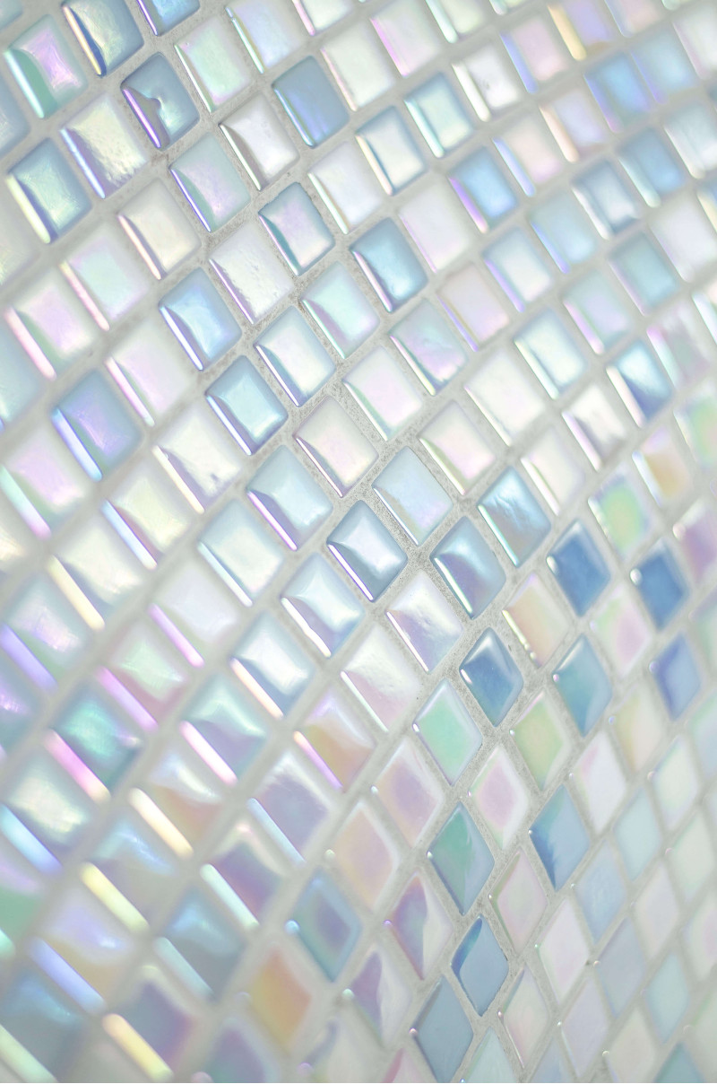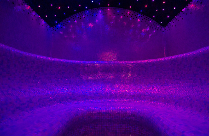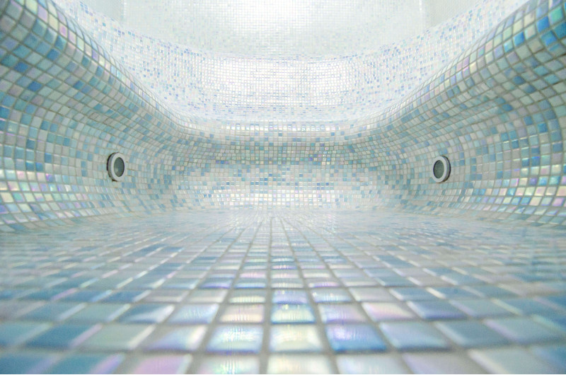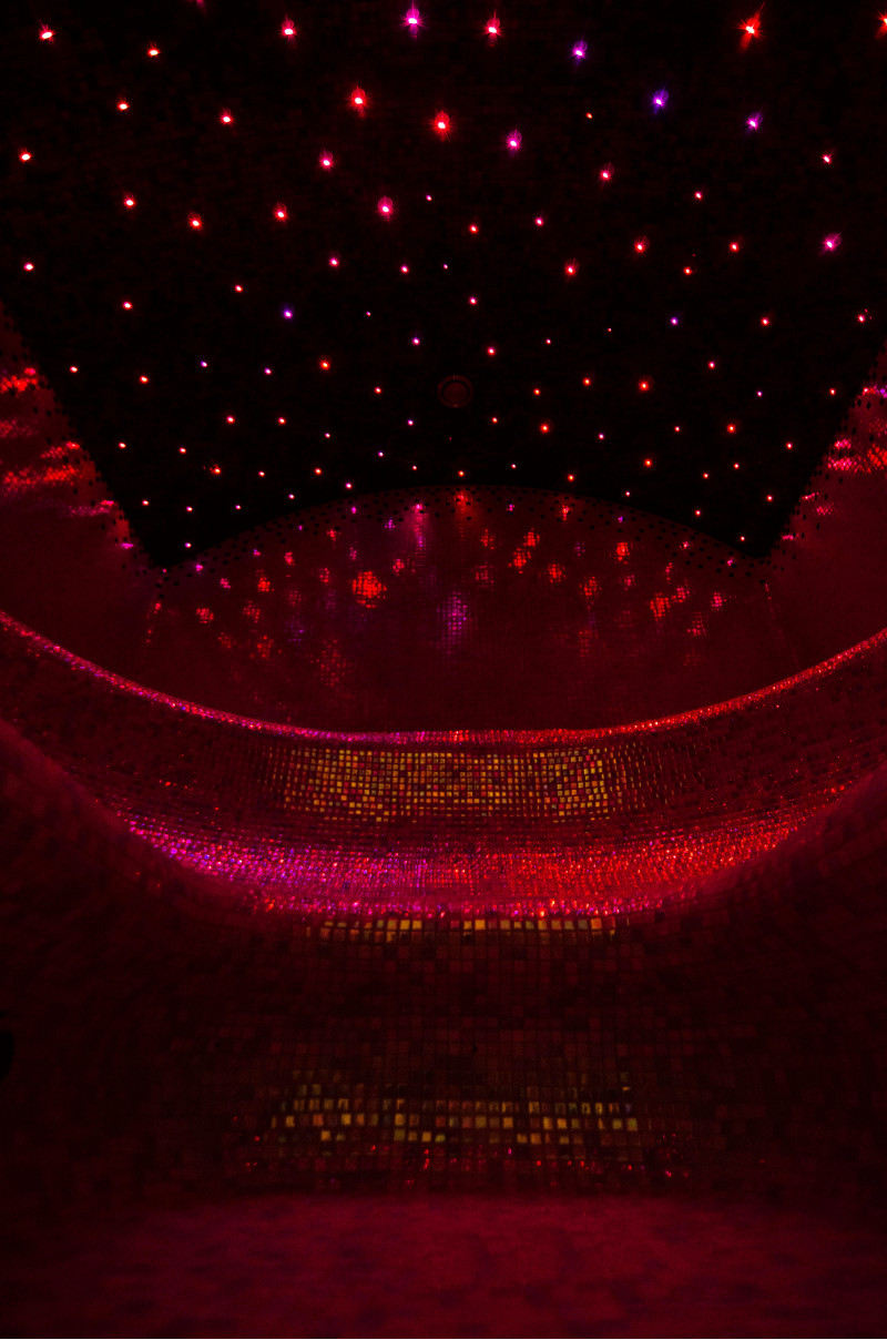 Los bancos, suelos y paredes están decorados con mosaicos de colores pastel. El techo está cubierto con azulejos de colores, que junto con la iluminación del techo dan una vista aún más impresionante.
