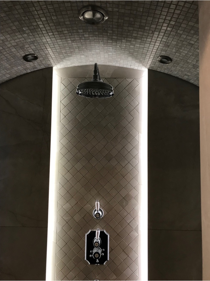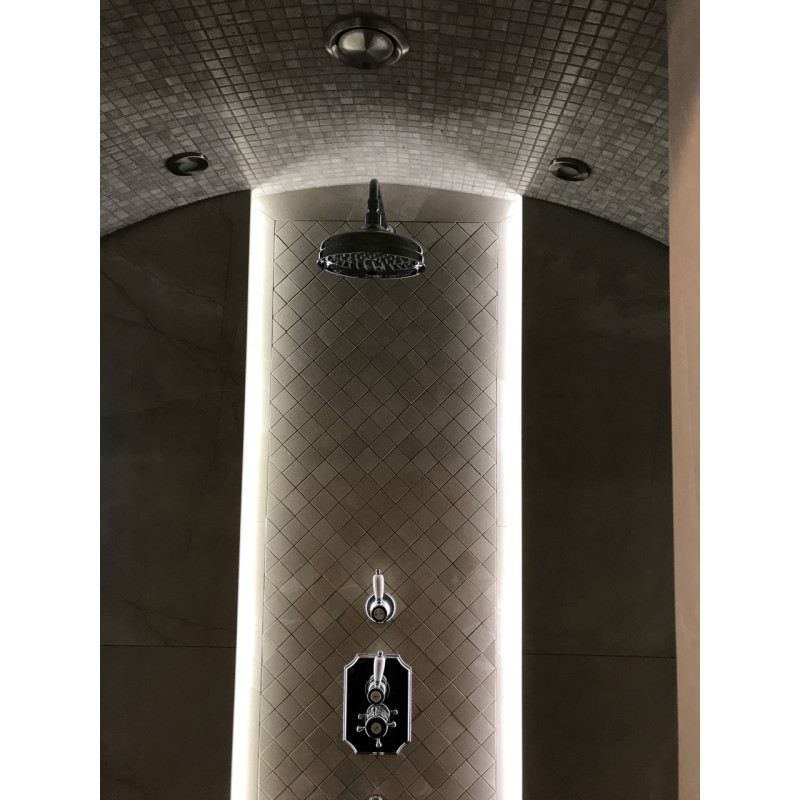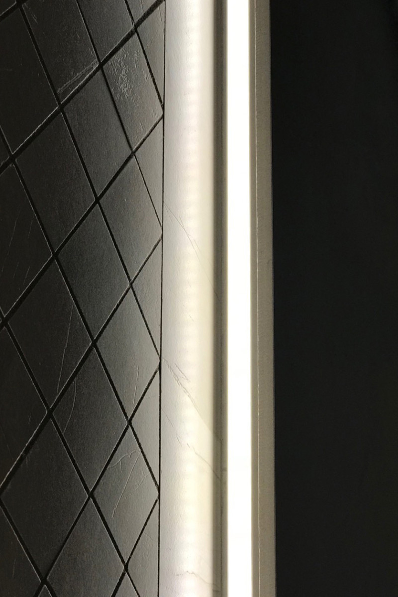 Tira de LED incorporada debajo de las tumbonas, en las paredes y cuatro candelabros en el techo.