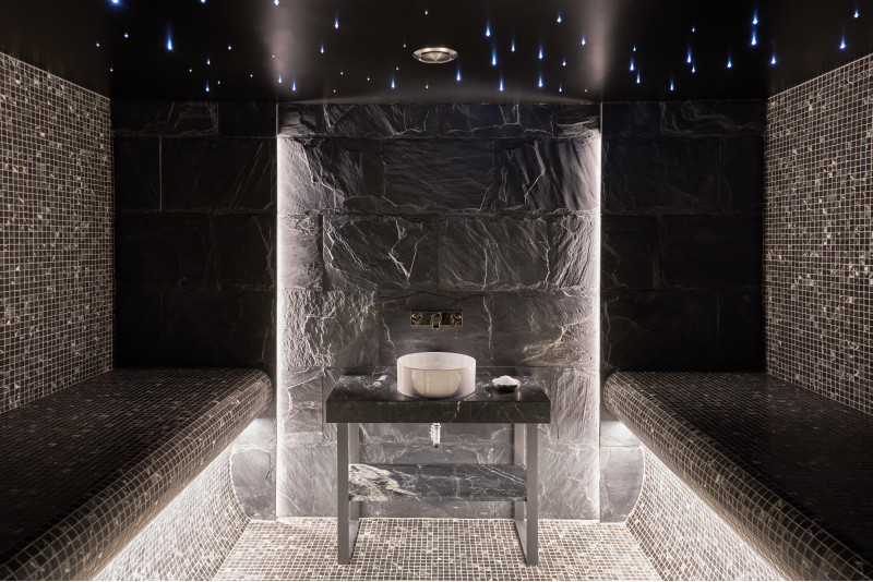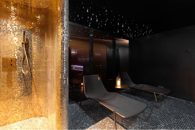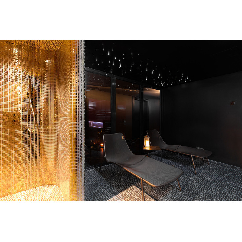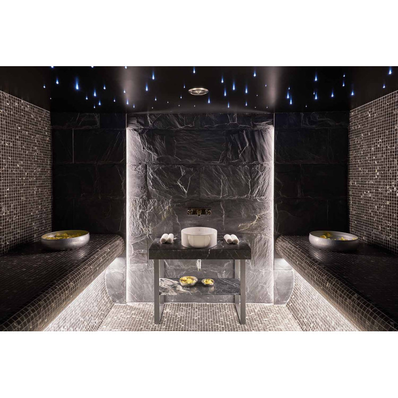 Para crear un estilo impecable, también se eligió una vitrina para la sala de hammam. Las superficies internas se forman según un proyecto individual hecho de poliestireno expandido utilizando estireno EPS de corte continuo. Las paredes, suelos y bancos de la habitación se calientan. El sistema de iluminación utiliza LED RGB IP 67, tiras de 9m y un sistema de fibra óptica "Starry Sky". Mosaico encolado, adaptado a la curvatura y relleno de impermeabilización Schonox gris.
