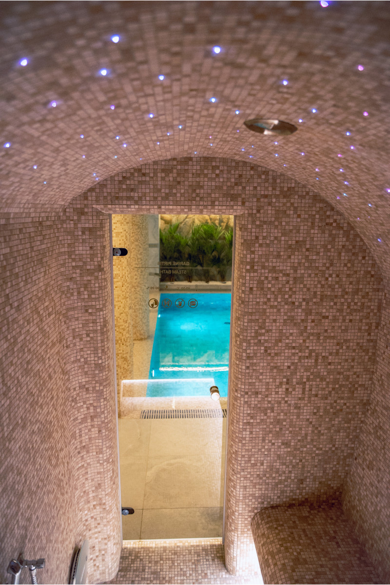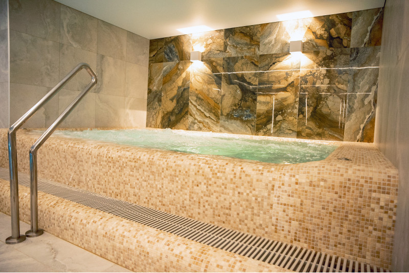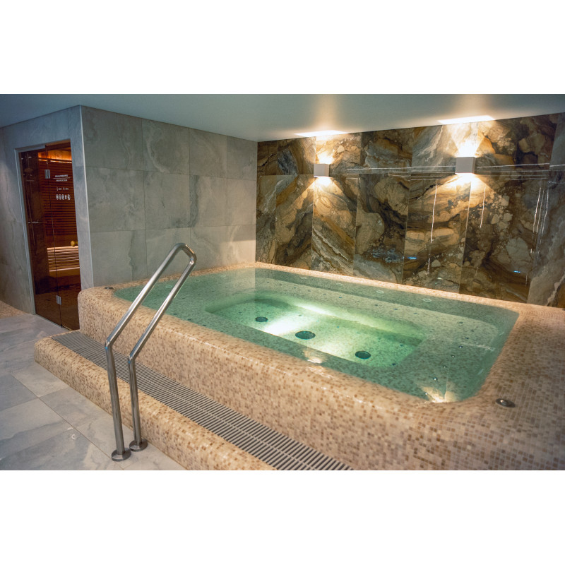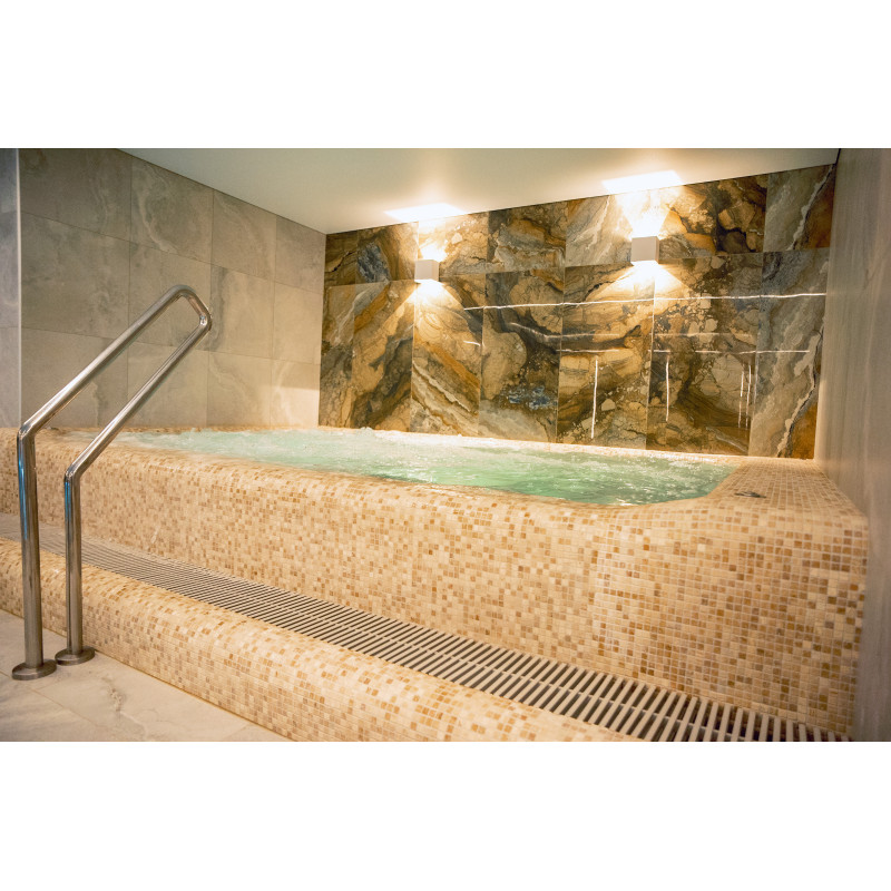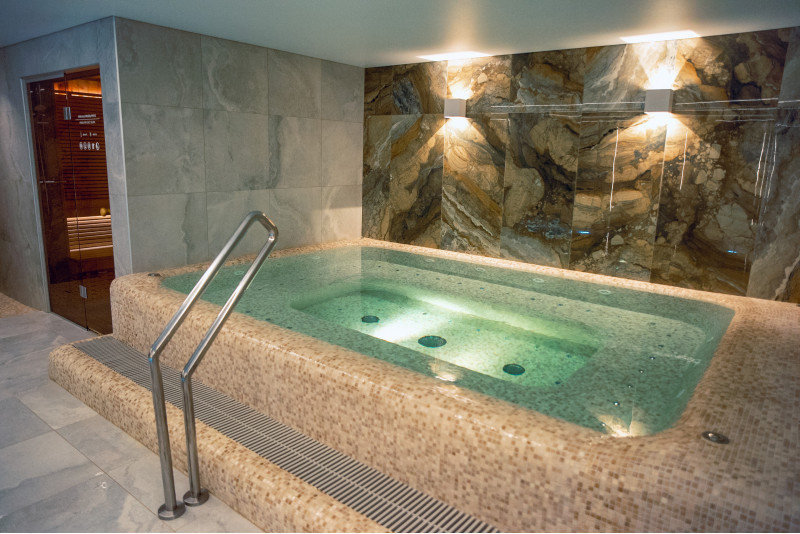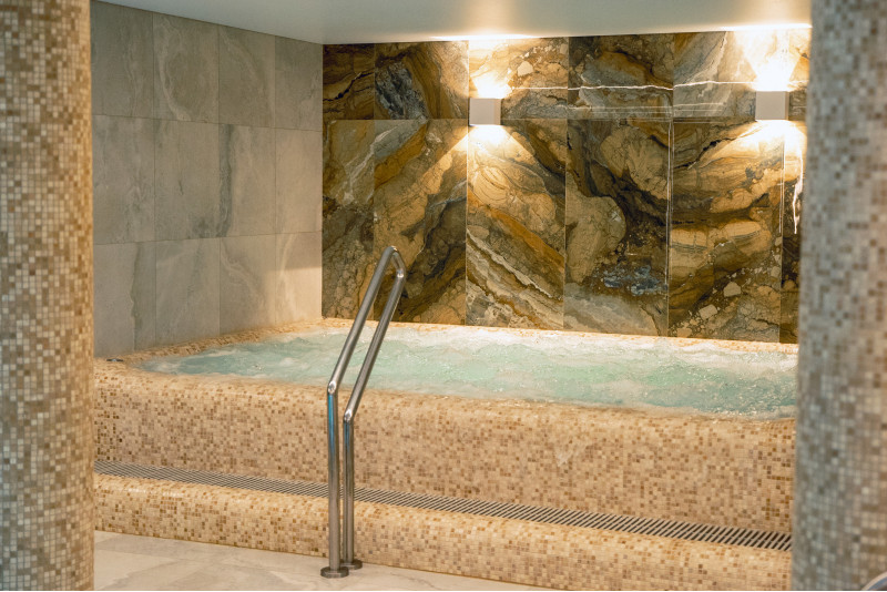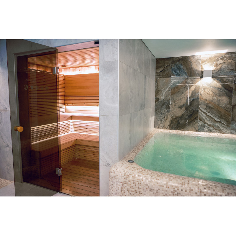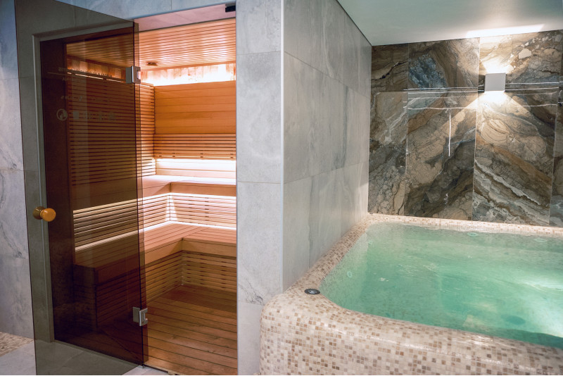 El complejo incluye una sala de vapor, una sauna, un generador de hielo y una piscina con chorro de masaje y jacuzzi.