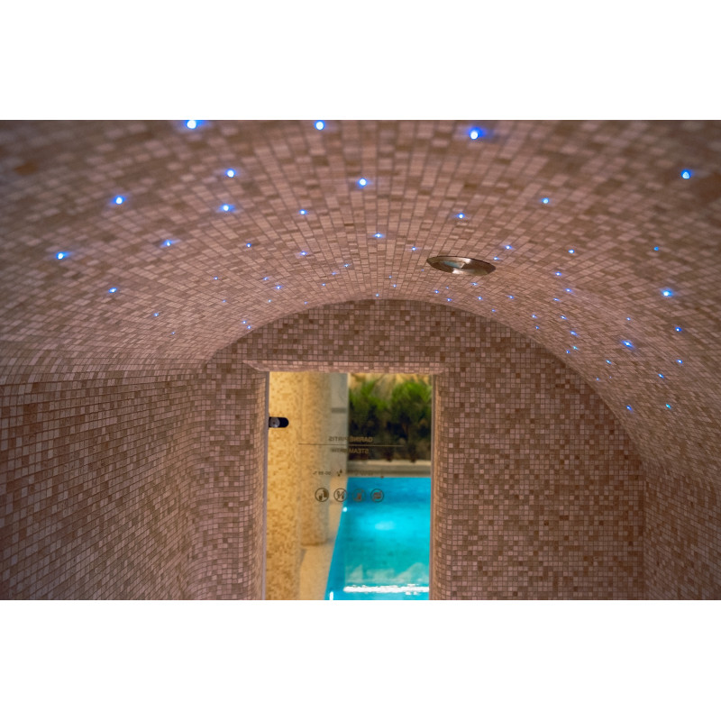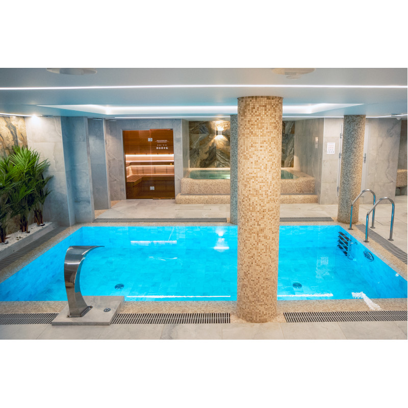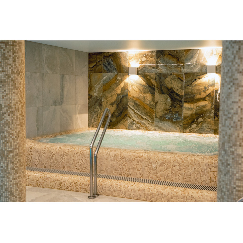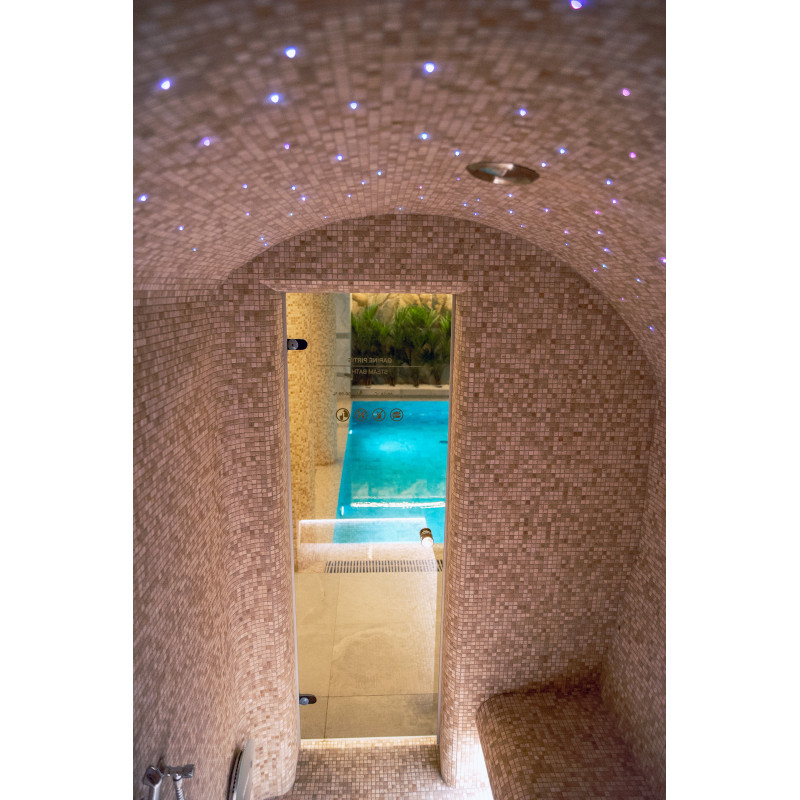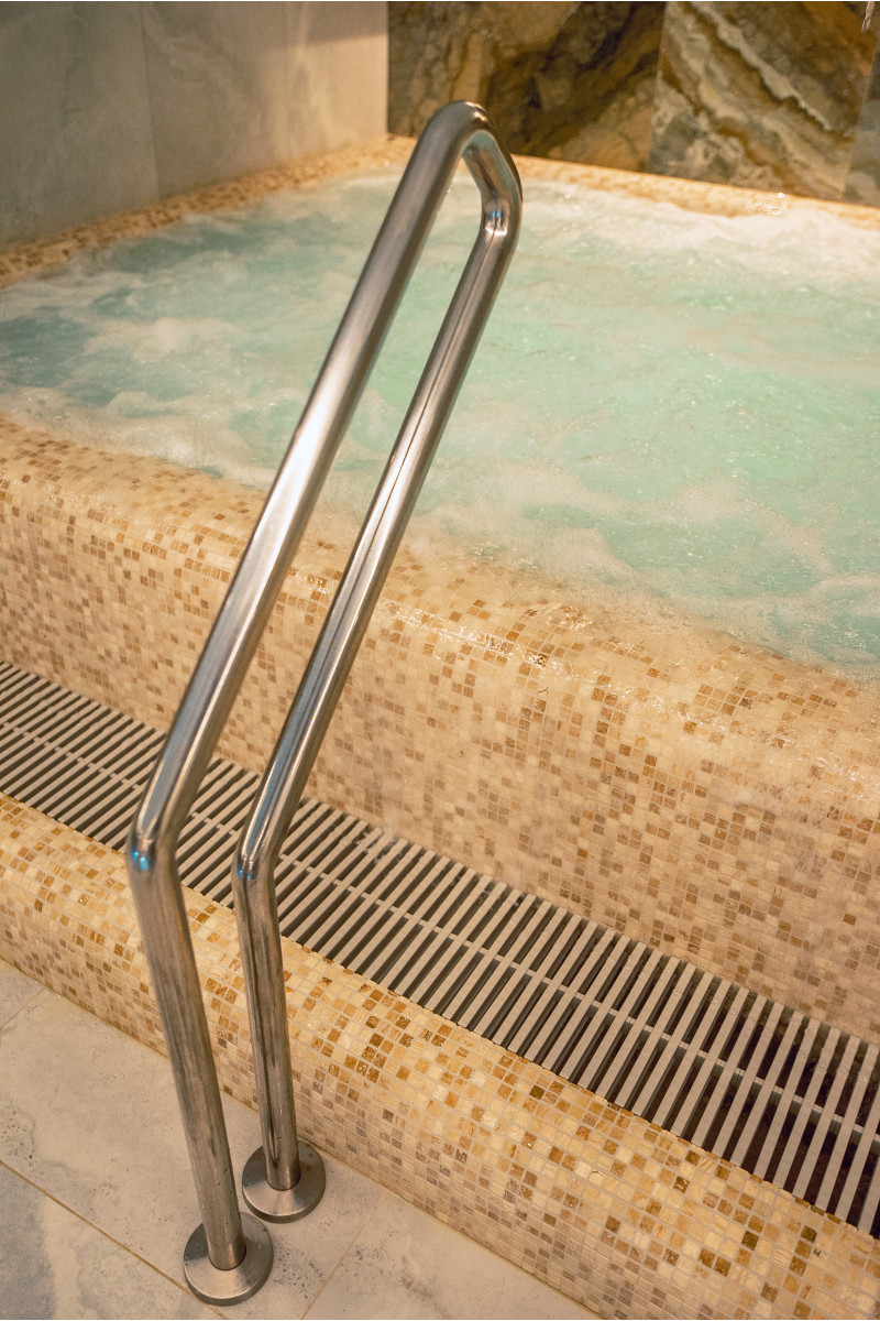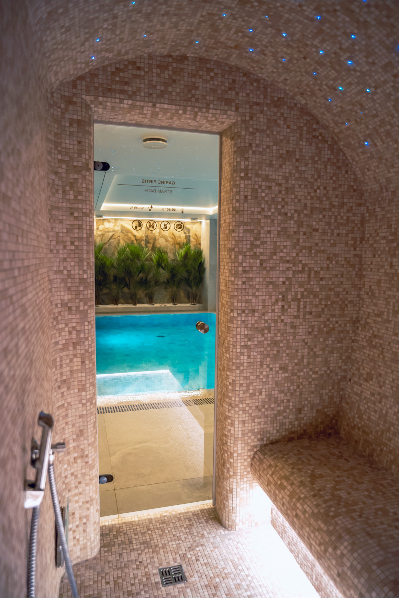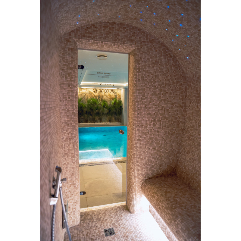 El complejo incluye una sala de vapor, una sauna, un generador de hielo y una piscina con chorro de masaje y jacuzzi.