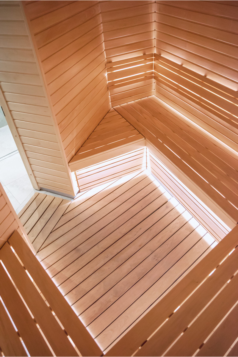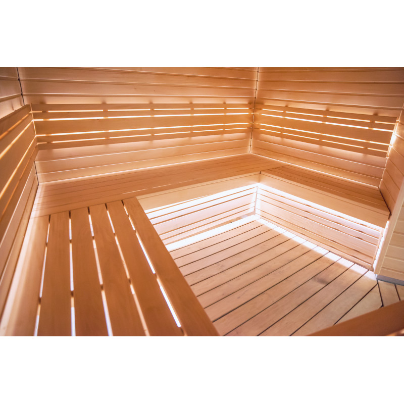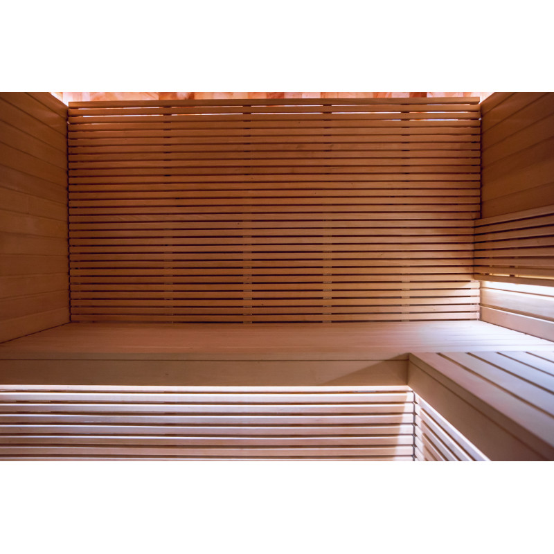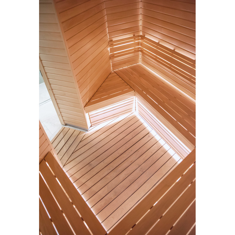 Se utilizó madera de tilo tipo A para las camas de la sauna, los respaldos, el techo de la sauna y los paneles de las paredes. La rejilla del suelo está hecha de madera de aliso negro.