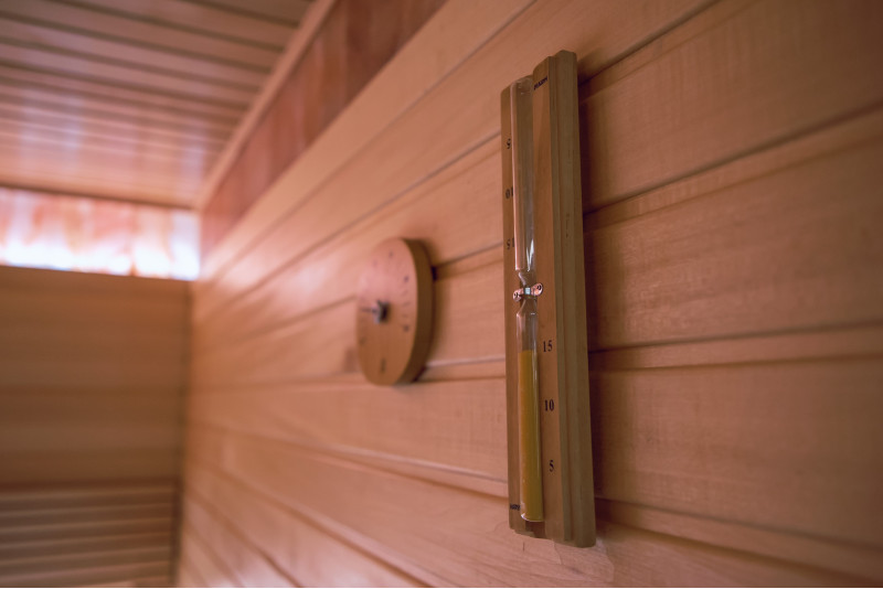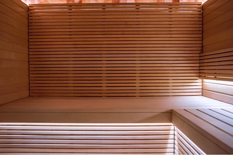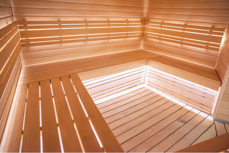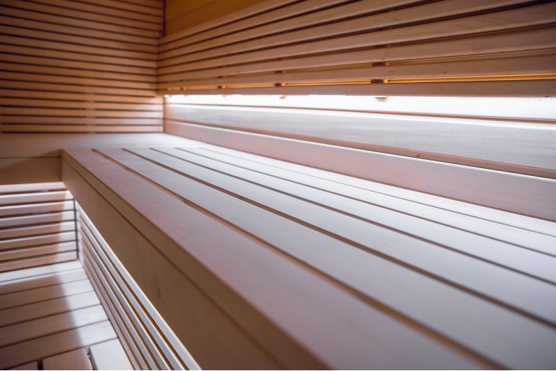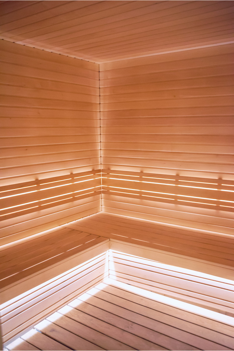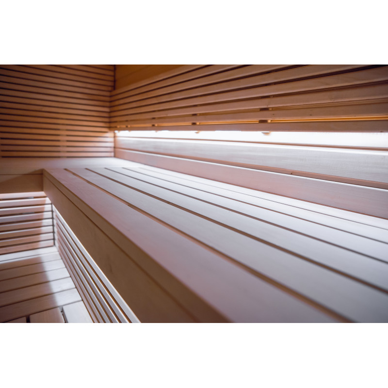 Se utilizó madera de tilo tipo A para las camas de la sauna, los respaldos, el techo de la sauna y los paneles de las paredes. La rejilla del suelo está hecha de madera de aliso negro.