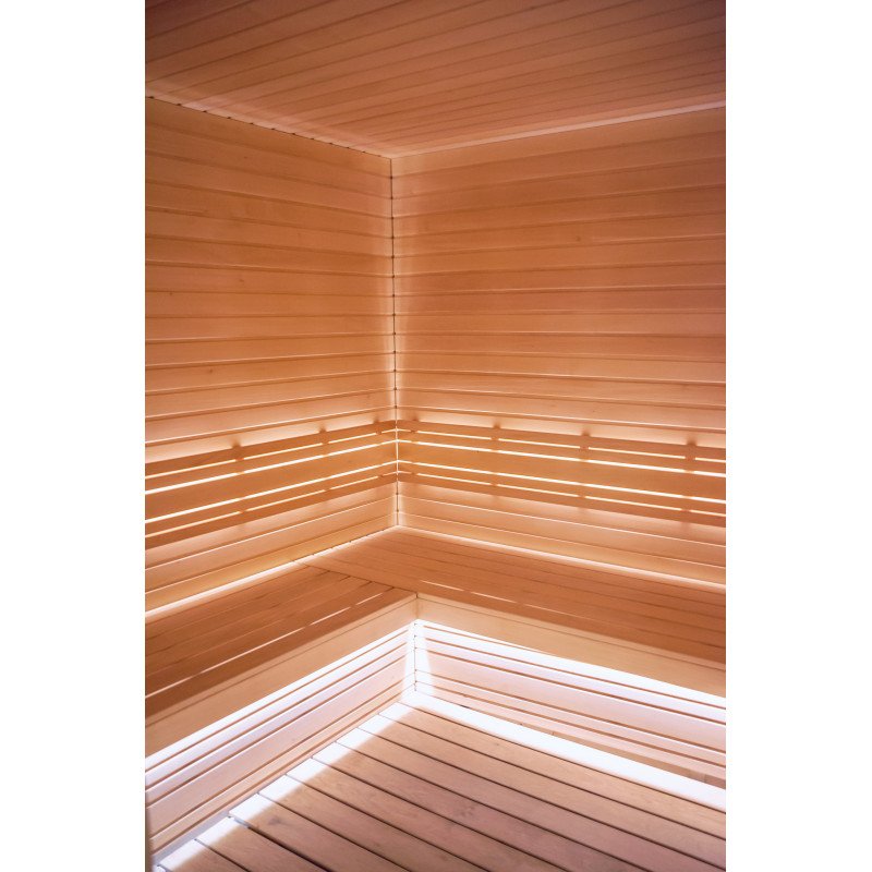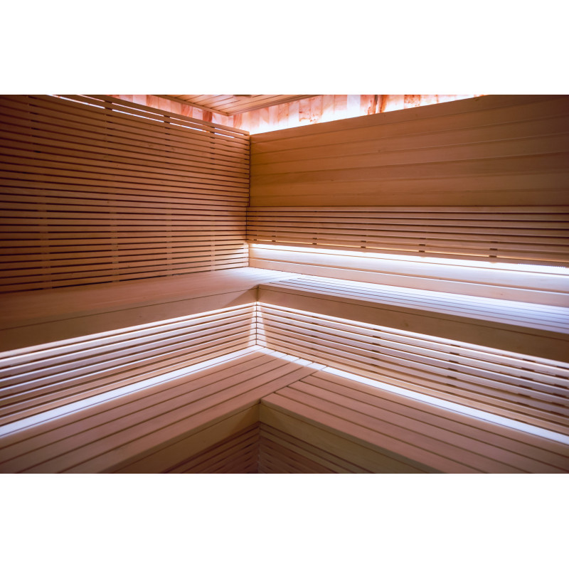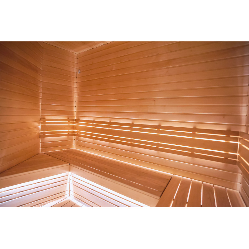 La sauna está equipada con equipo de ventilación, iluminación LED bajo las literas superiores y en los soportes traseros.