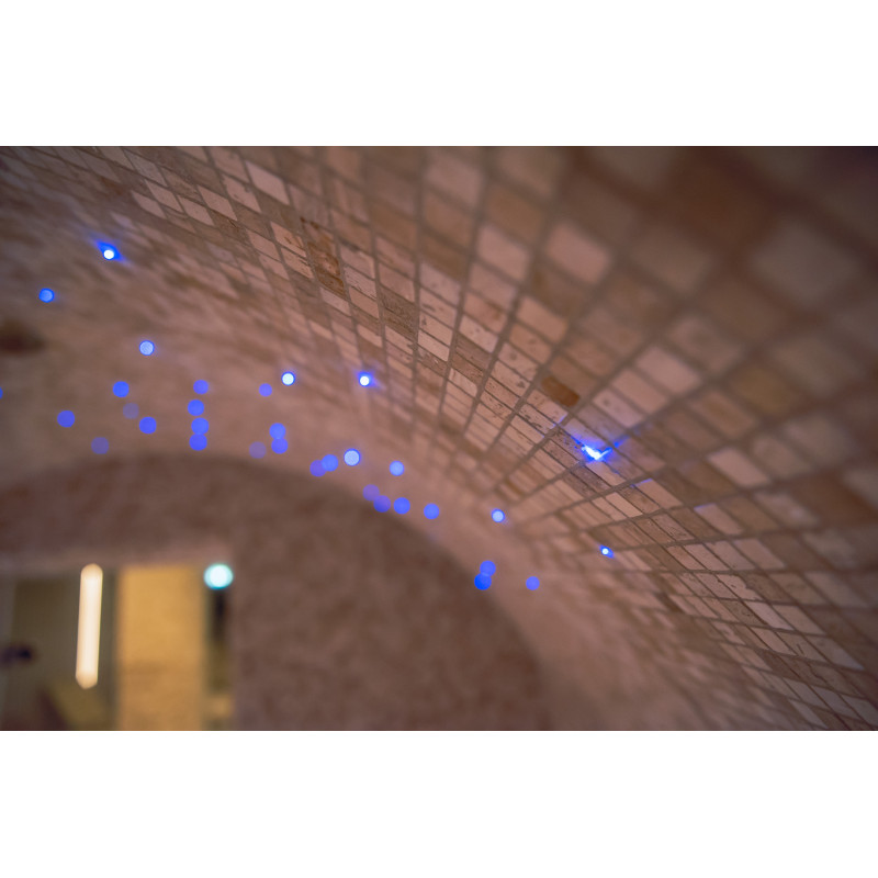 La iluminación LED está instalada debajo de la litera superior, en los respaldos y detrás de la tira de ladrillos de sal del Himalaya.