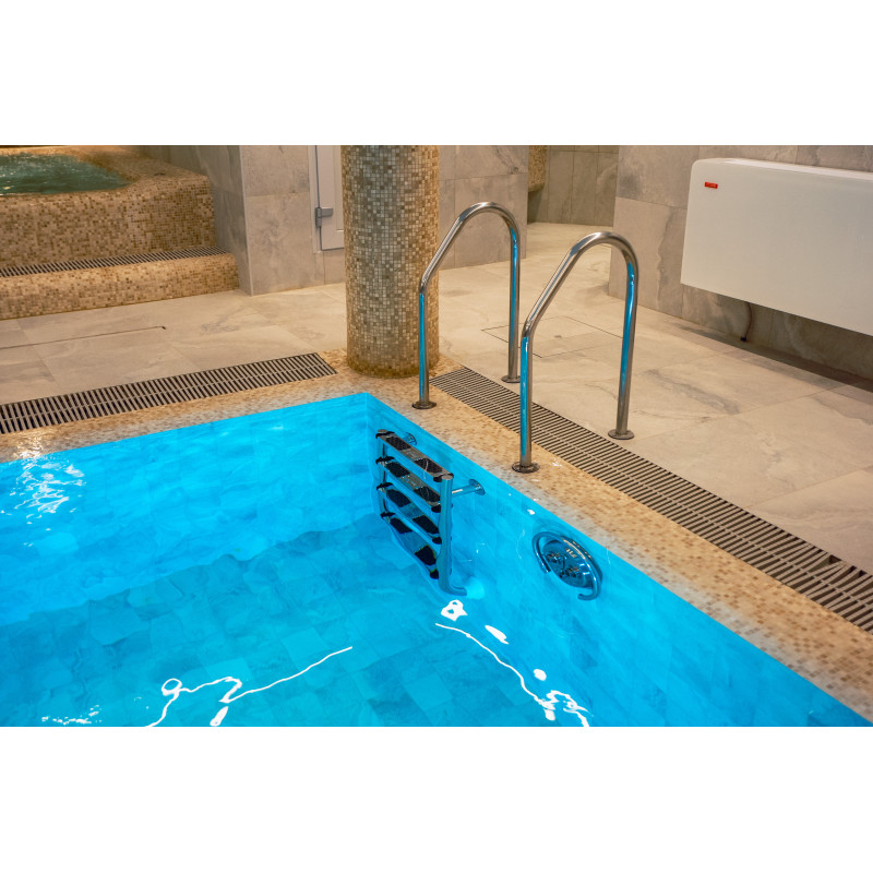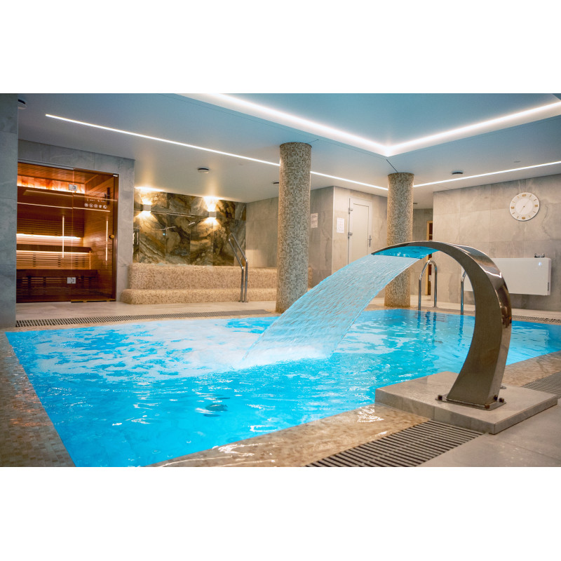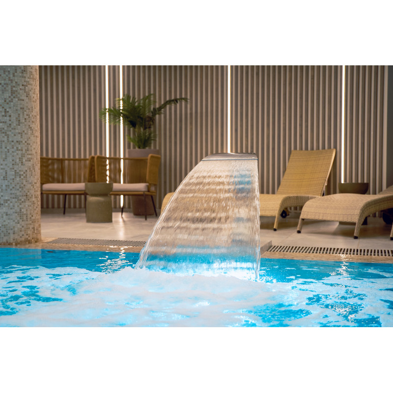 Filtros, bomba de circulación, bomba de masaje, estación de dosificación automática de productos químicos, calentador de agua, esterilizador UV, foco subacuático LED, chorros dobles de agua y aire, chorros de masaje de aire, rejilla de desbordamiento, cubierta de piscina, etc.