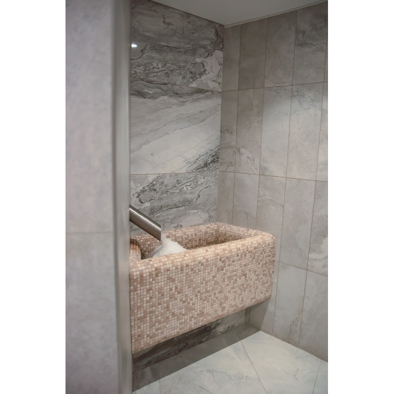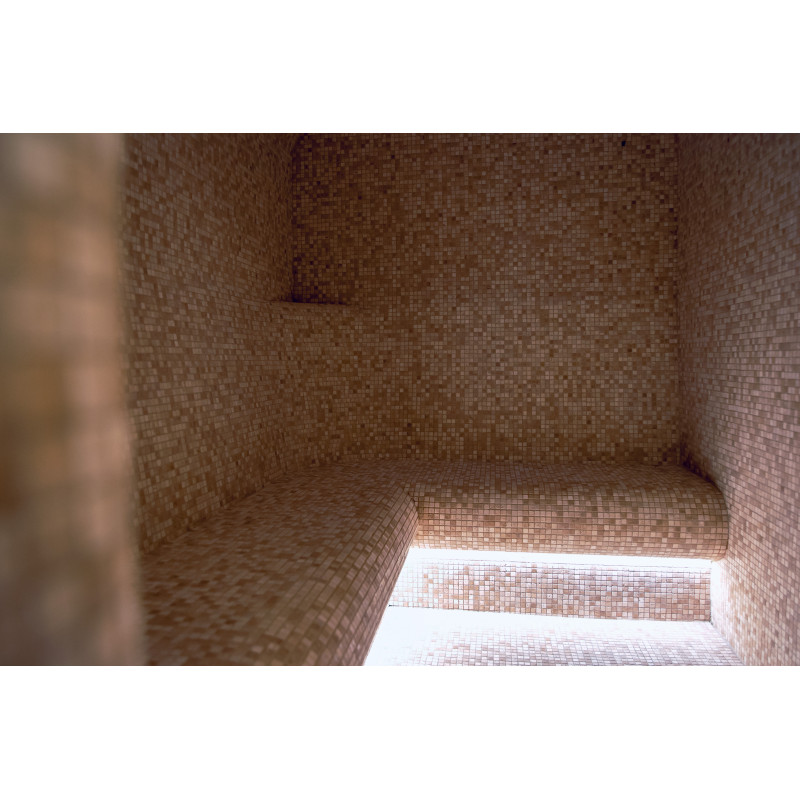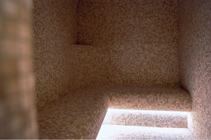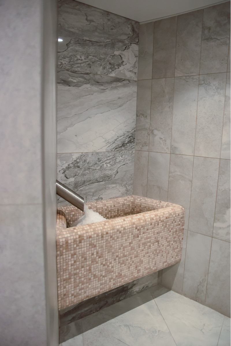 Las superficies interiores están moldeadas a partir de poliestireno expandido utilizando estireno XPS de corte continuo. Se forma un arco de techo. Se colocan baldosas de mosaico. Se ha instalado un sistema de ventilación.
