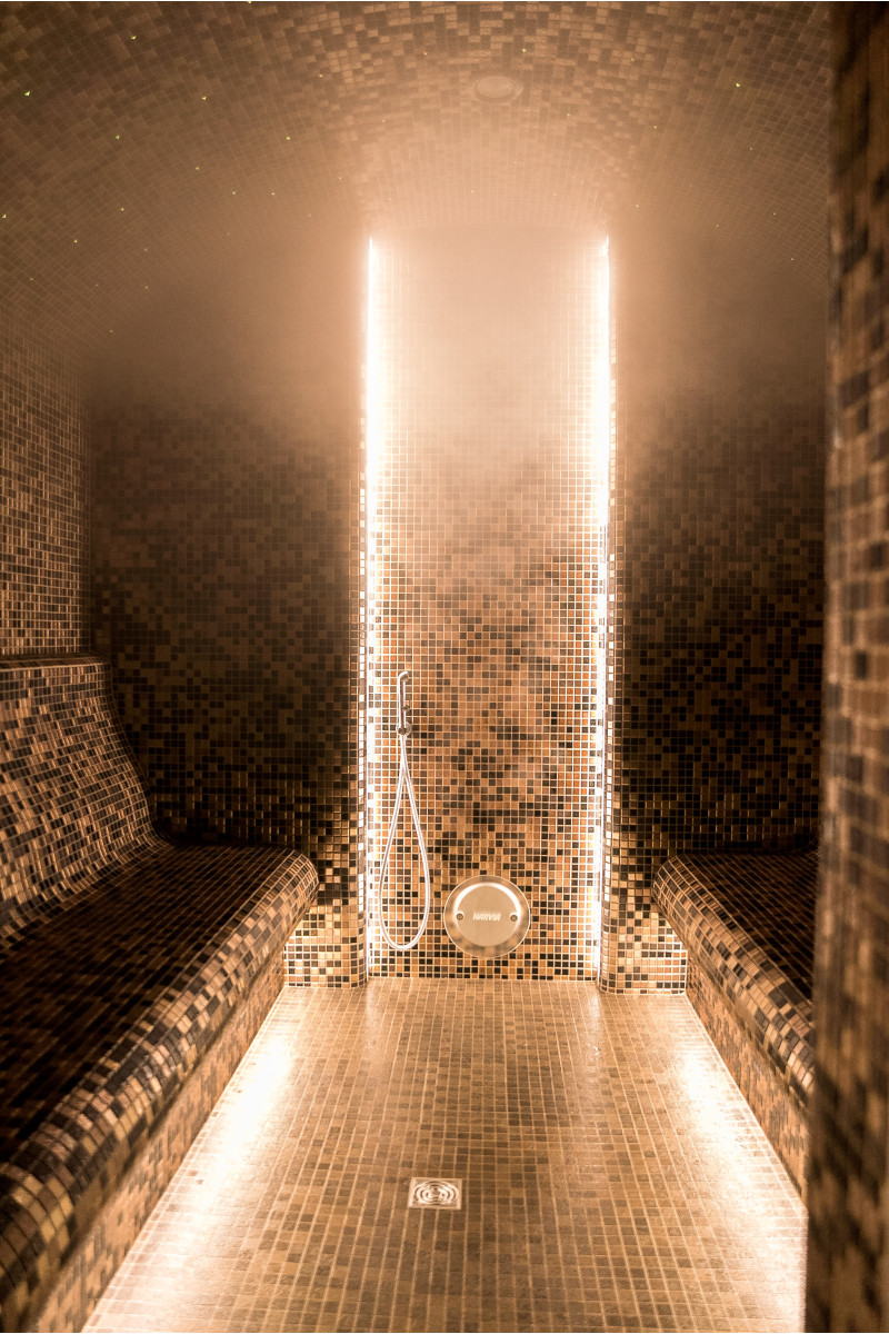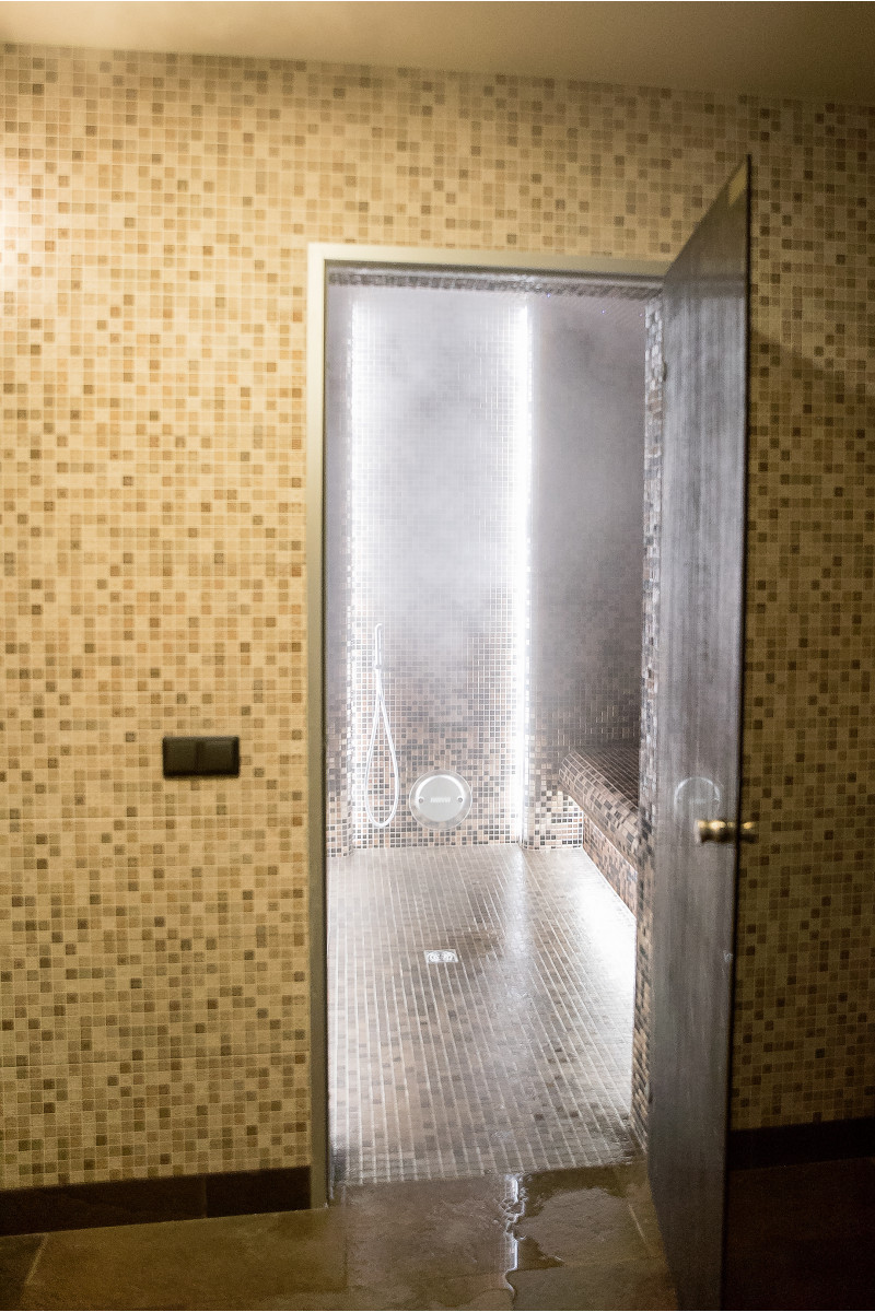 Bancos realizados según proyecto individual, perfil con respaldo. El techo tiene una forma arqueada que es típica de todas las saunas de vapor.
