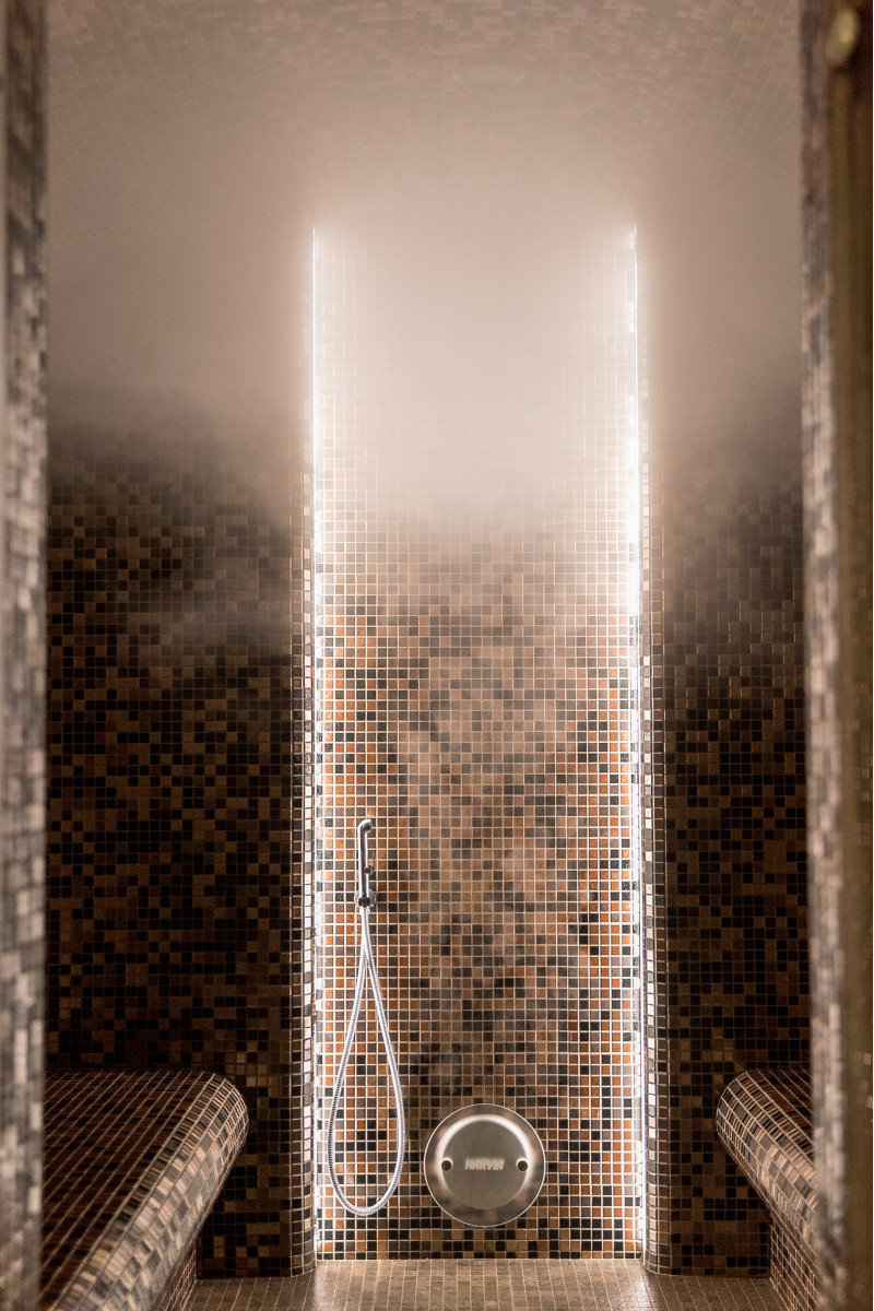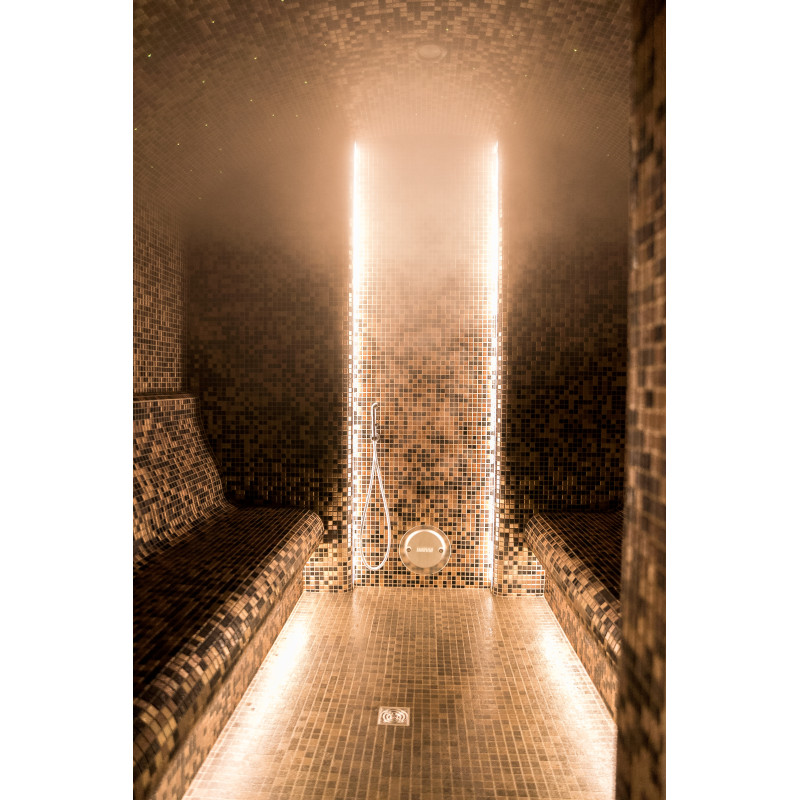 Para iluminar la sauna se utilizó el sistema de iluminación de fibra óptica "Cielo estrellado" - Flujo de luz LED con colores cambiables.