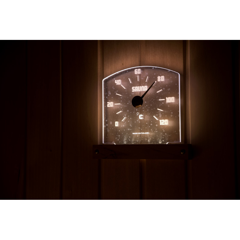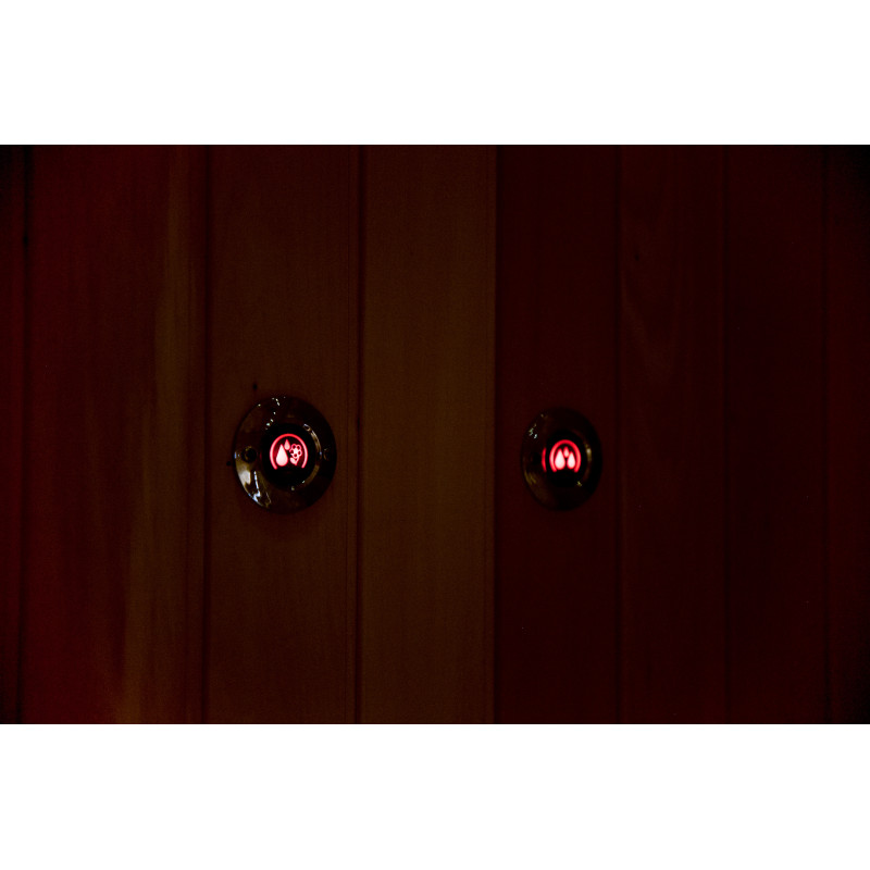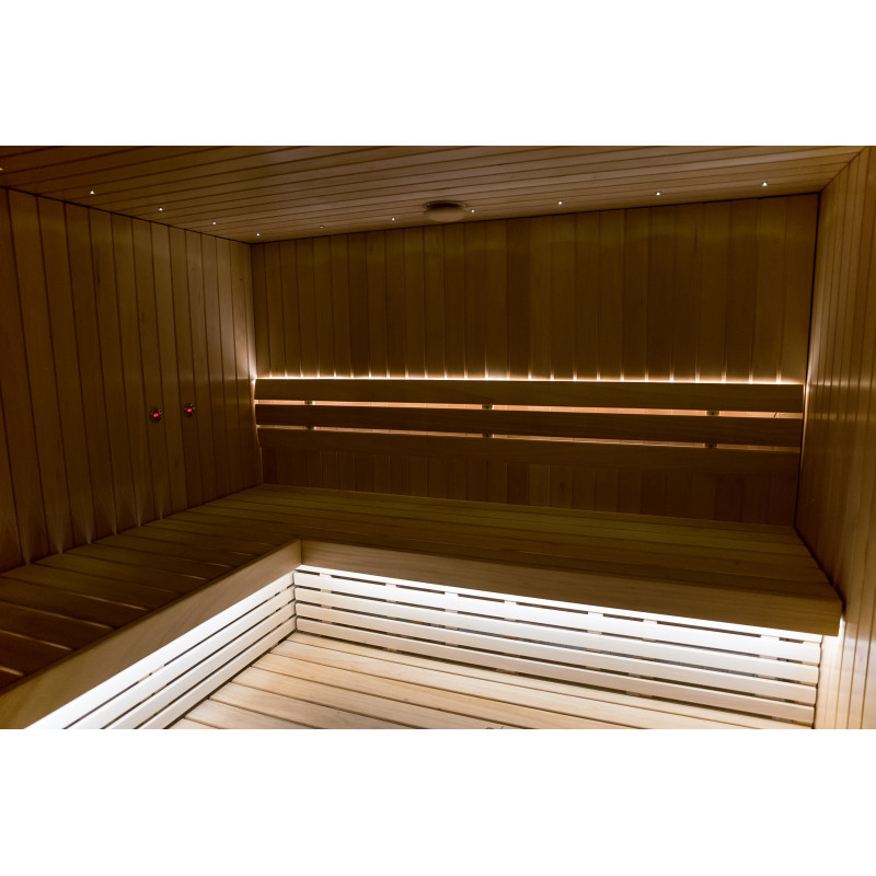 Equipado con iluminación RGB en color debajo de los bancos superiores y respaldos. Esta iluminación de sauna es resistente a la humedad y la temperatura. El color de la iluminación se puede cambiar según su estado de ánimo.