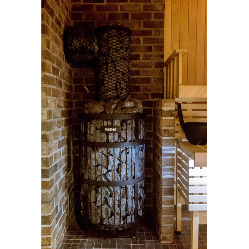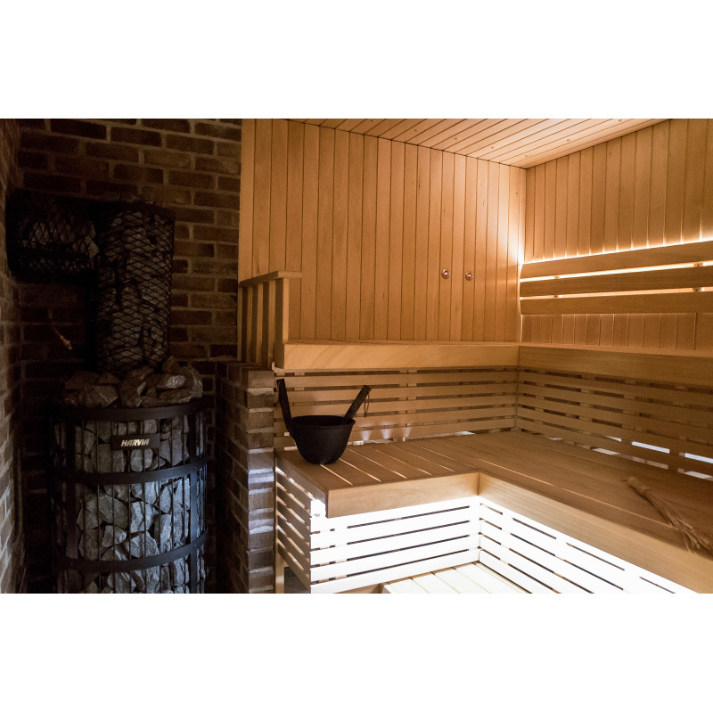 El calentador, Harvia Legend 300 Duo, es una buena opción para una sauna de tamaño mediano. El calefactor dispone de chimenea exterior, por lo que conviene calentarlo desde otra estancia. Además, este calentador tiene capacidad para una gran cantidad de piedras, por lo que puedes disfrutar del calor que irradian incluso en ausencia de altas temperaturas. El calentador tiene una puerta de hierro fundido y una ventana de vidrio.