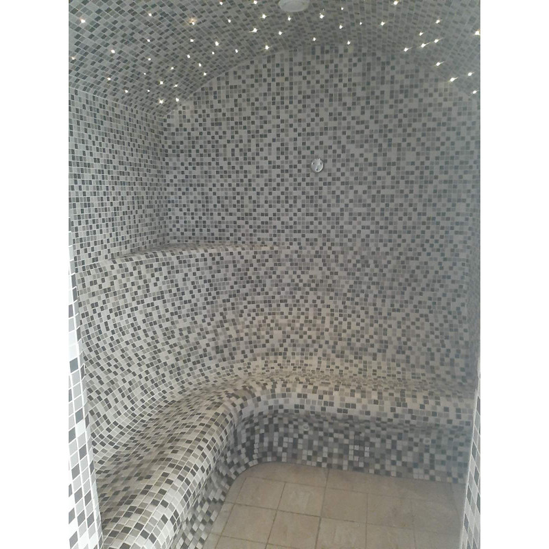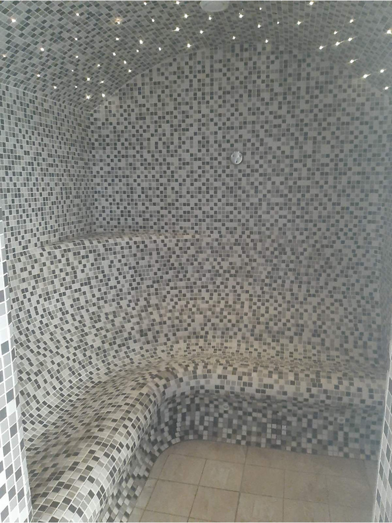 - Sauna de vapor: materiales usados que pueden soportar temperaturas extremadamente altas y humedad muy alta. El techo es de tipo arco para que el vapor condensado no gotee sobre las personas que disfrutan de la sauna. Para la decoración se ha optado por baldosas e iluminación de fibra óptica para el techo, creando un efecto de cielo estrellado. Los bancos tienen una forma especialmente cómoda.