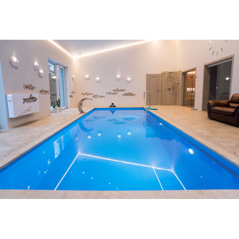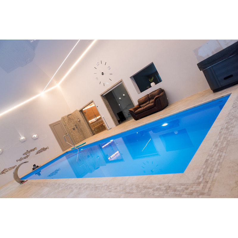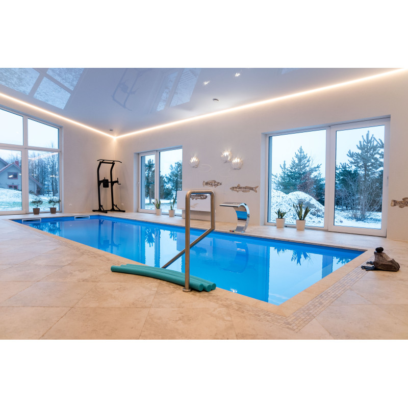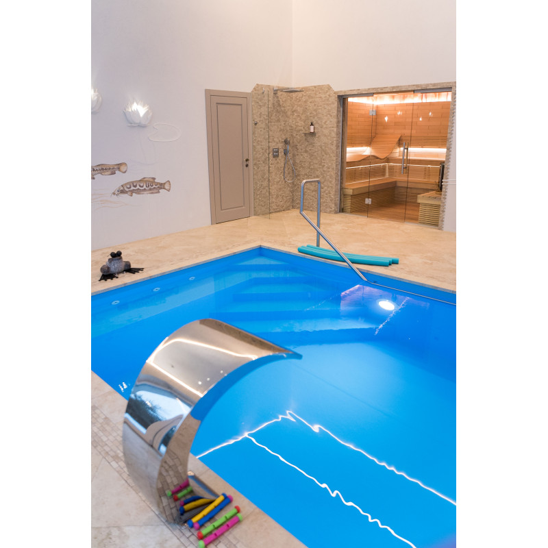 Equipada con corriente de nado, cascada de agua, banco de masajes, pasamanos, escaleras e iluminación subacuática.
