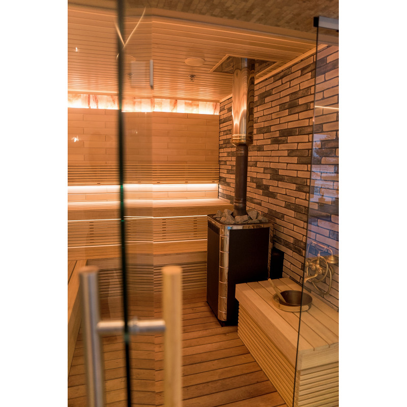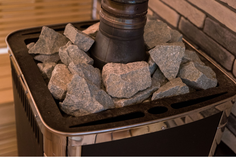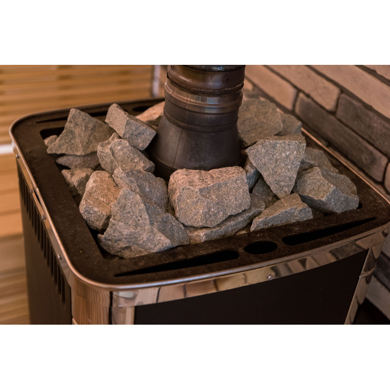 Estufa de sauna de leña - TMF KALINA VITRA. La estufa está llena de piedras mixtas: olivino finlandés y jadeíta rota.