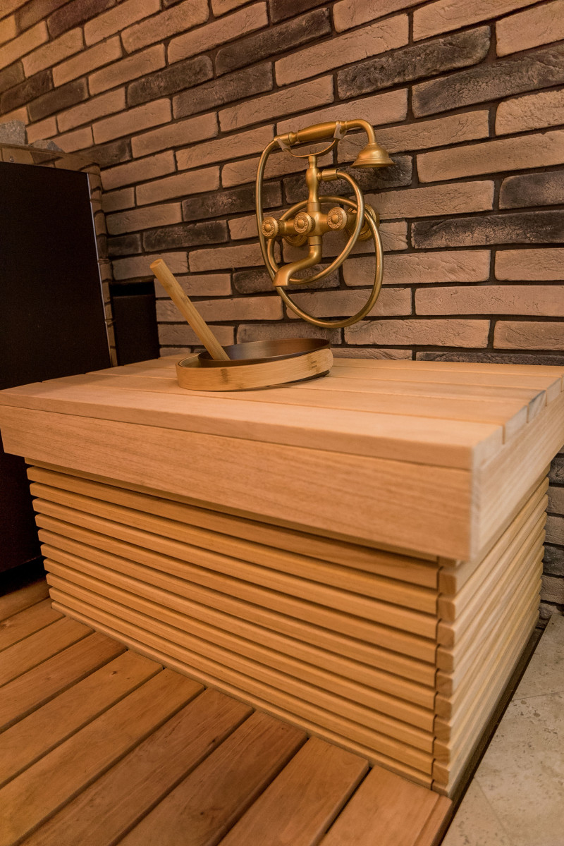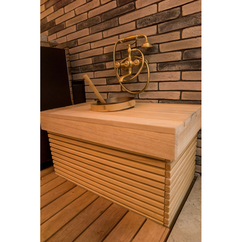 Decoración interior de la sauna: madera de tilo, tablas de cama, rejillas de piso: madera de abachi. Las camas, soportes y paredes están impregnadas de aceite y barnizadas.