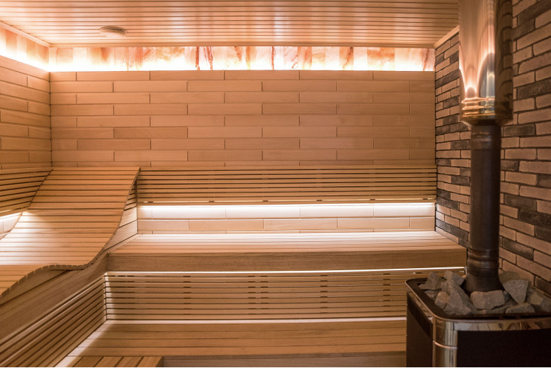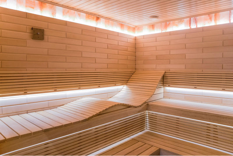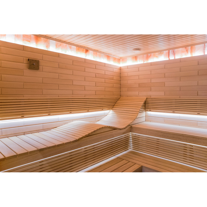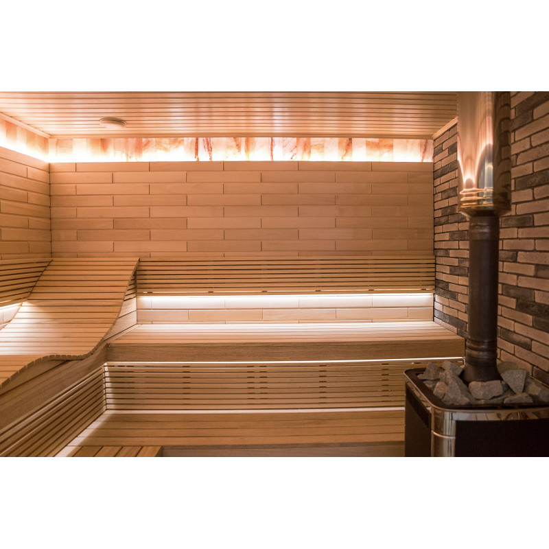 La barra de sal del Himalaya está iluminada por LED. También se instala iluminación en los respaldos y debajo de la litera superior.