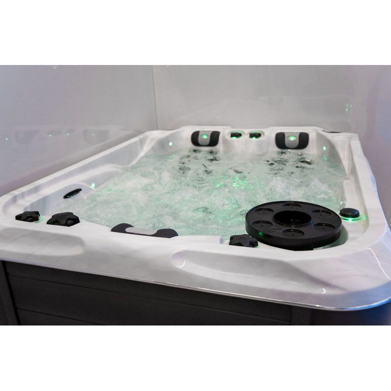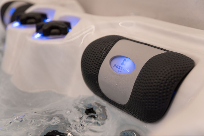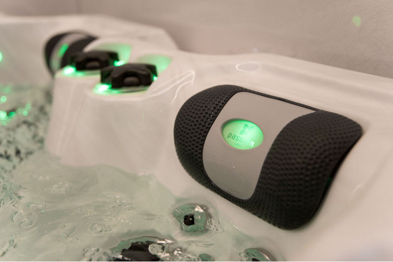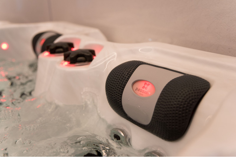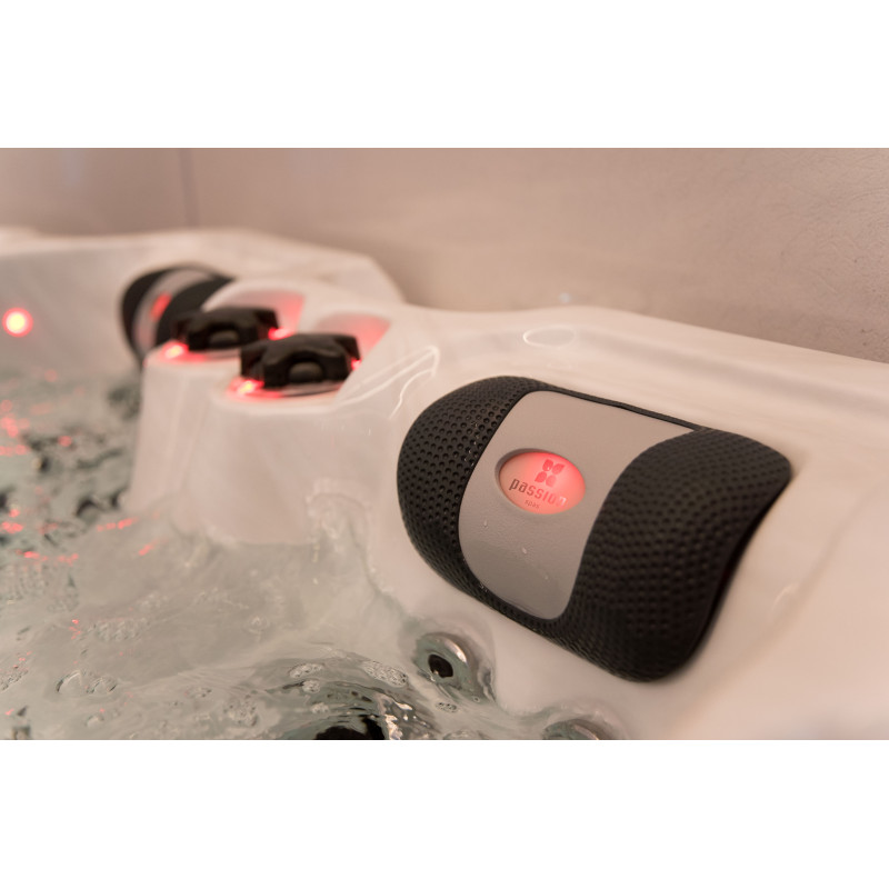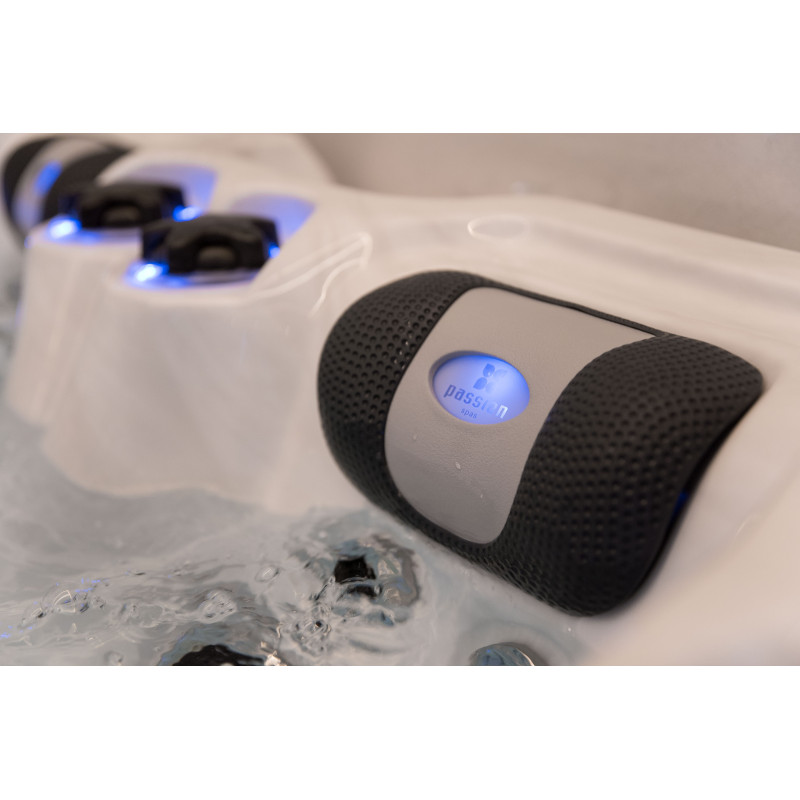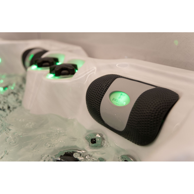 La piscina del spa está equipada con iluminación LED de colores, que se ve especialmente hermosa en la oscuridad. Todos los controles y cojines brindan iluminación de acento que, combinada con el sistema de sonido integrado de Passion Spas, crea una experiencia mágica.