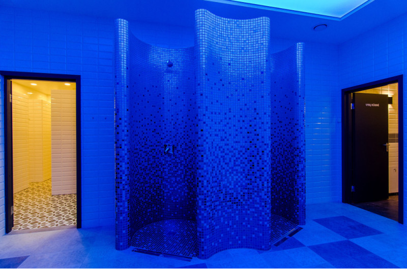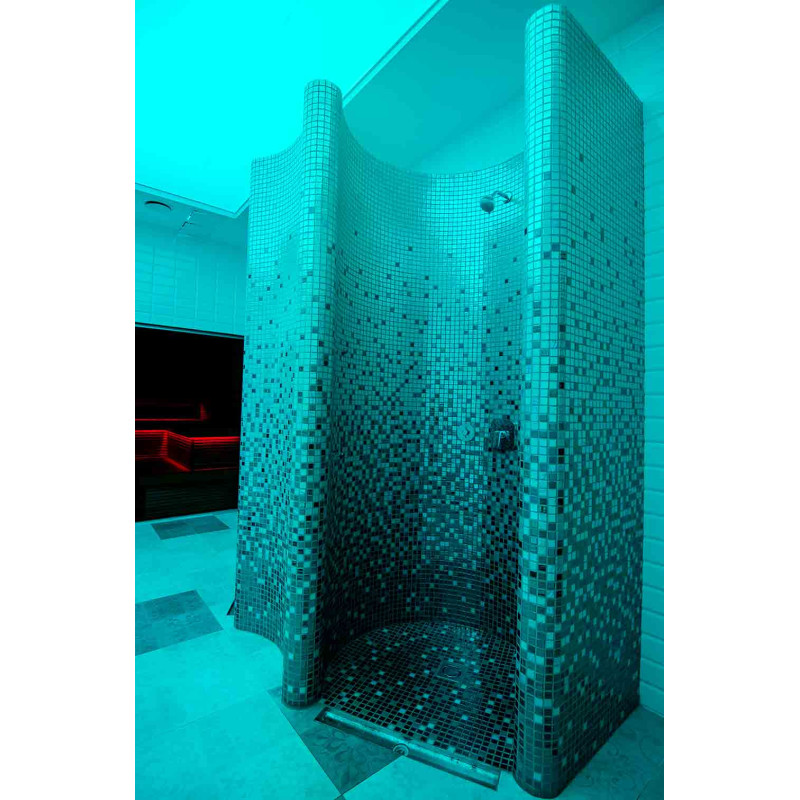 Los moldes de ducha están hechos de XPS 300, según las especificaciones. tecnología de corte según diseño individual. Moldes montados, impermeabilizados con impermeabilizante lubricado Schonox. Mosaico encolado, adaptado a la curvatura y relleno de impermeabilización Schonox gris. Duchas - para diferentes propósitos. Uno de ellos, para un simple lavado, el otro, para refrescarse después de una sauna, con chorros laterales de agua fría.