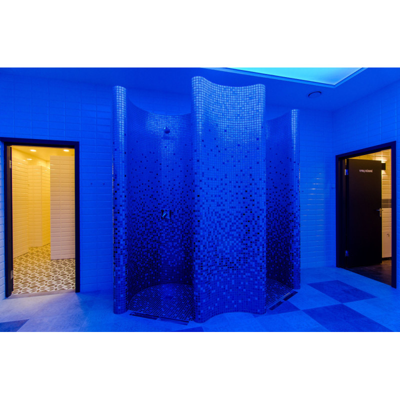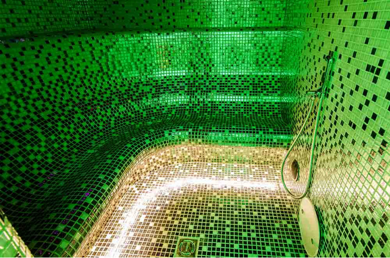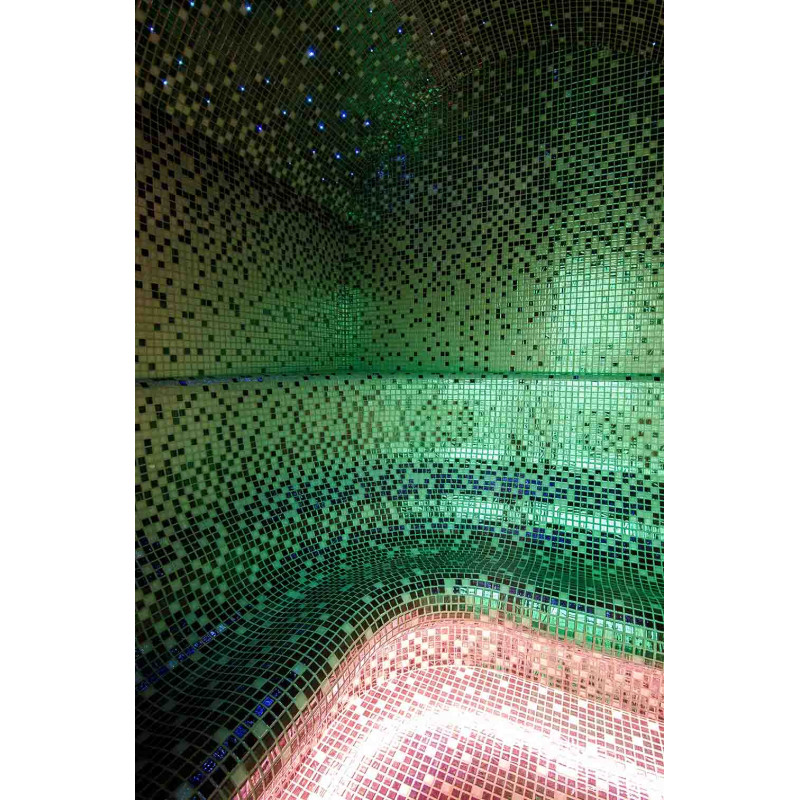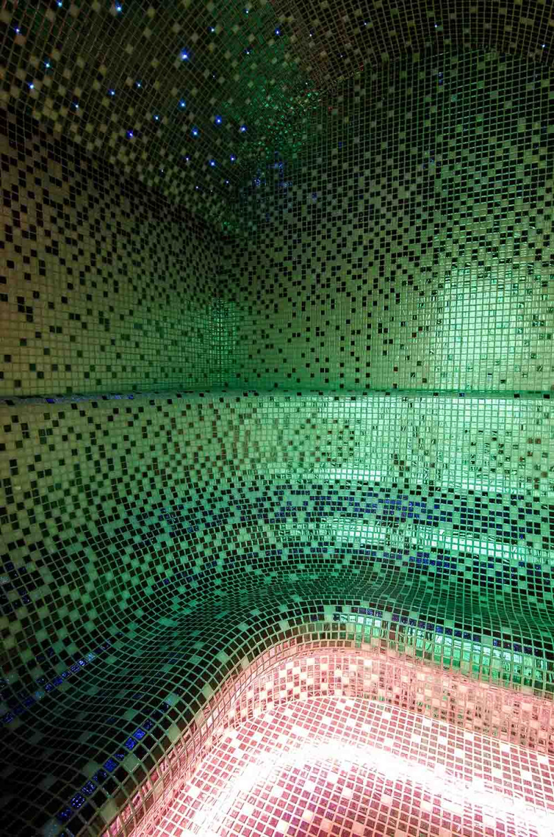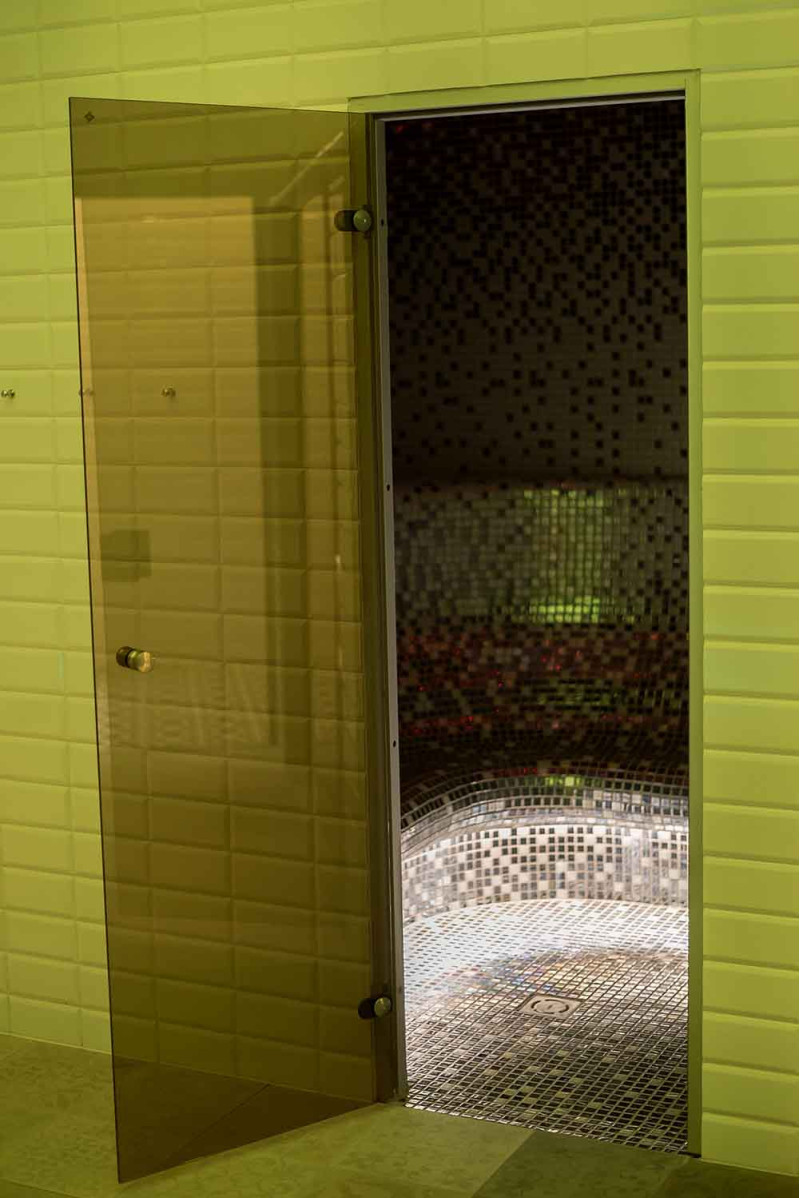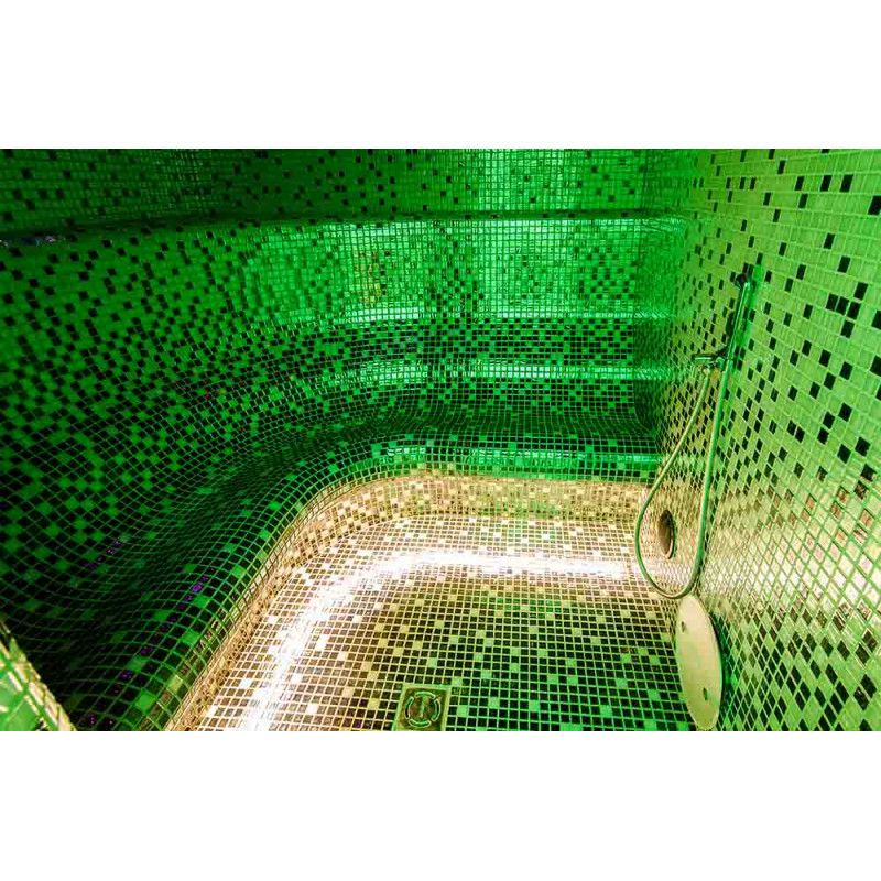 Las superficies internas del baño de vapor se forman según un proyecto individual de poliestireno expandido, utilizando estireno EPS de corte continuo. Mosaico encolado, adaptado a la curvatura y relleno de impermeabilización Schonox gris. El suelo de la habitación se calienta. Puertas: marco de aluminio, vidrio tintado templado. Equipo de baño de vapor:
