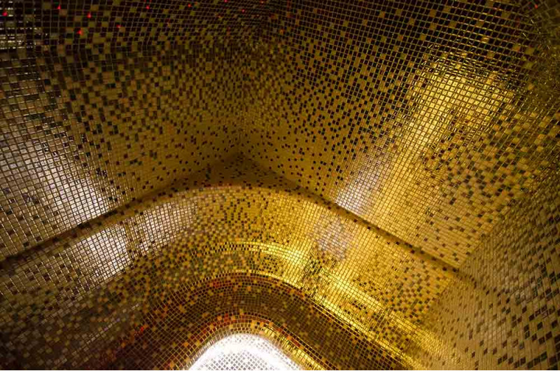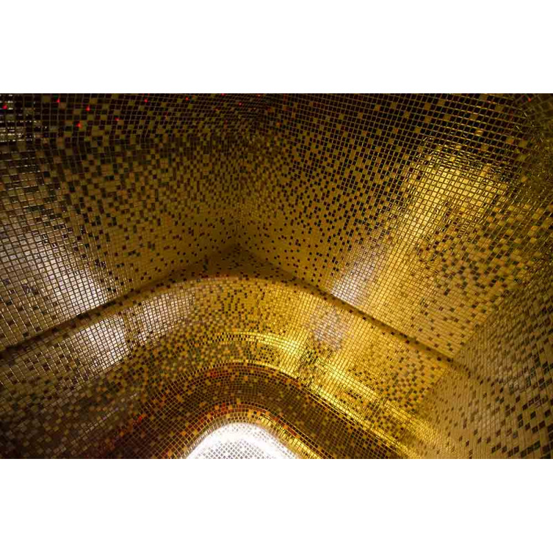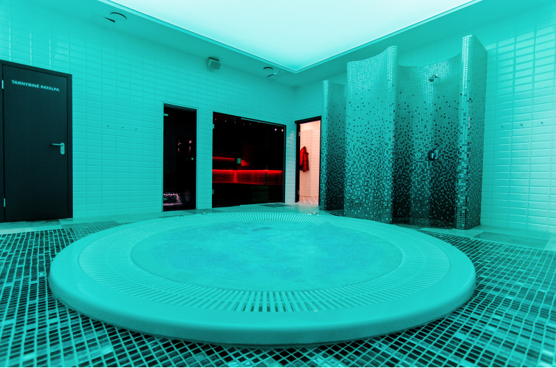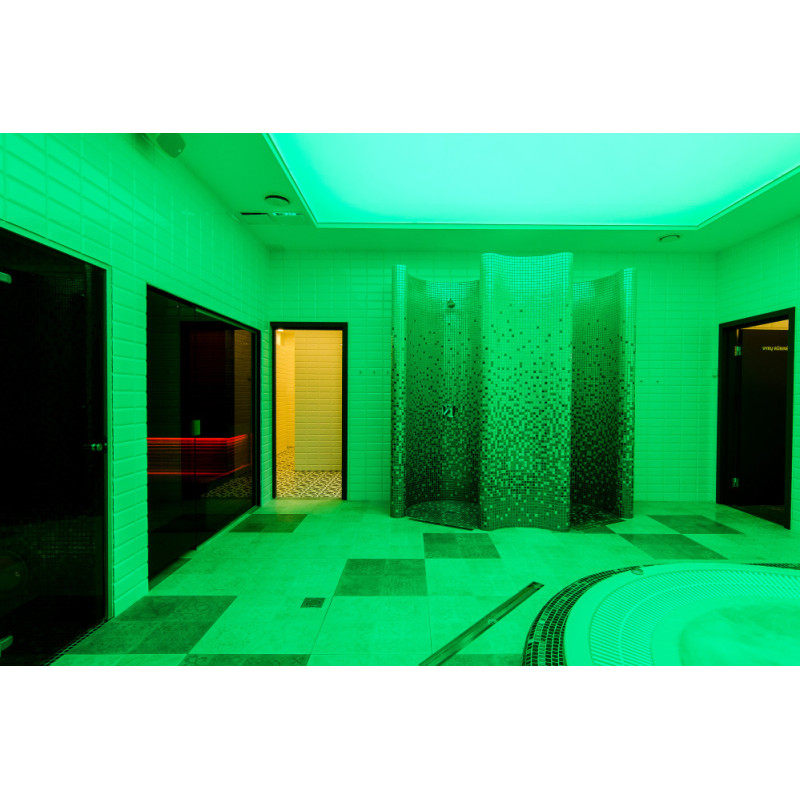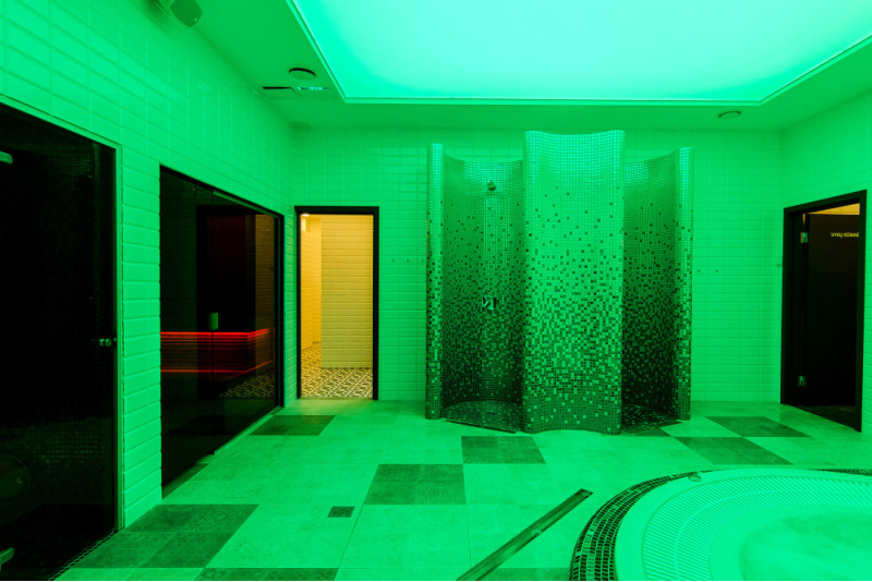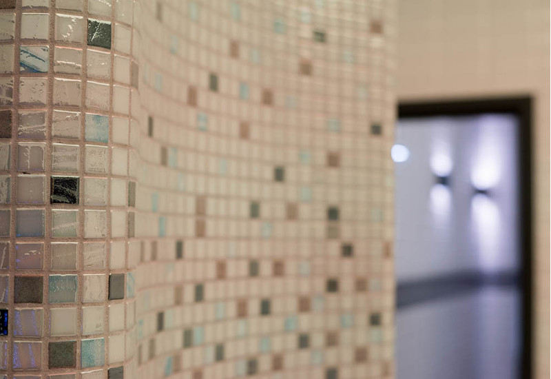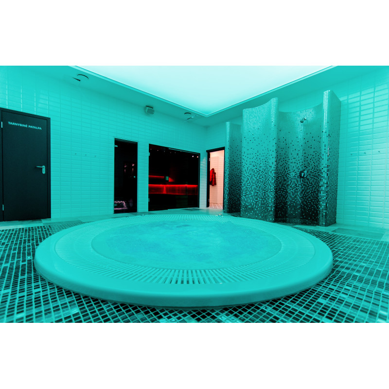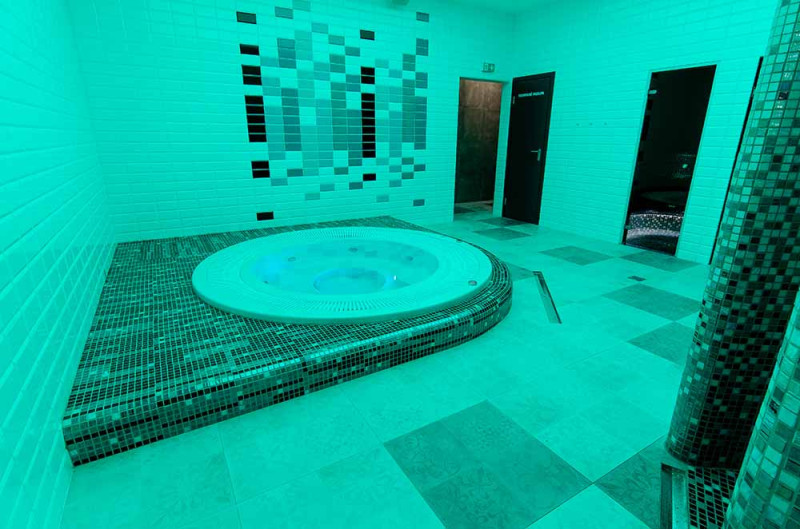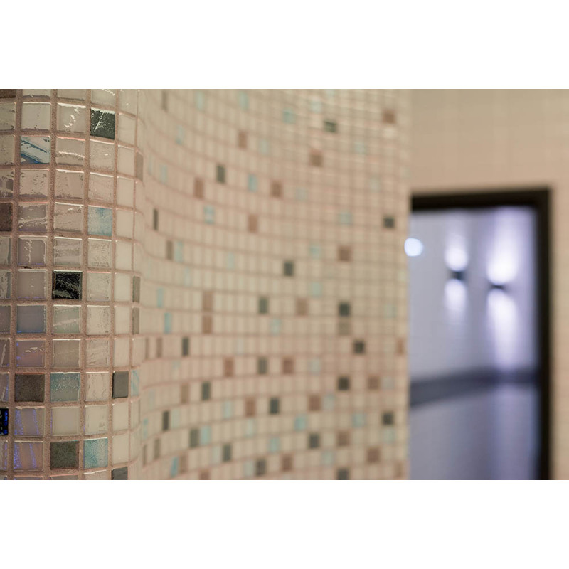 Las superficies internas del baño de vapor se forman según un proyecto individual de poliestireno expandido, utilizando estireno EPS de corte continuo. Mosaico encolado, adaptado a la curvatura y relleno de impermeabilización Schonox gris. El suelo de la habitación se calienta. Puertas: marco de aluminio, vidrio tintado templado. Equipo de baño de vapor: