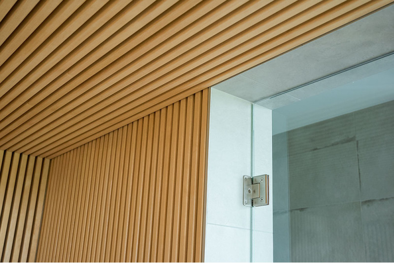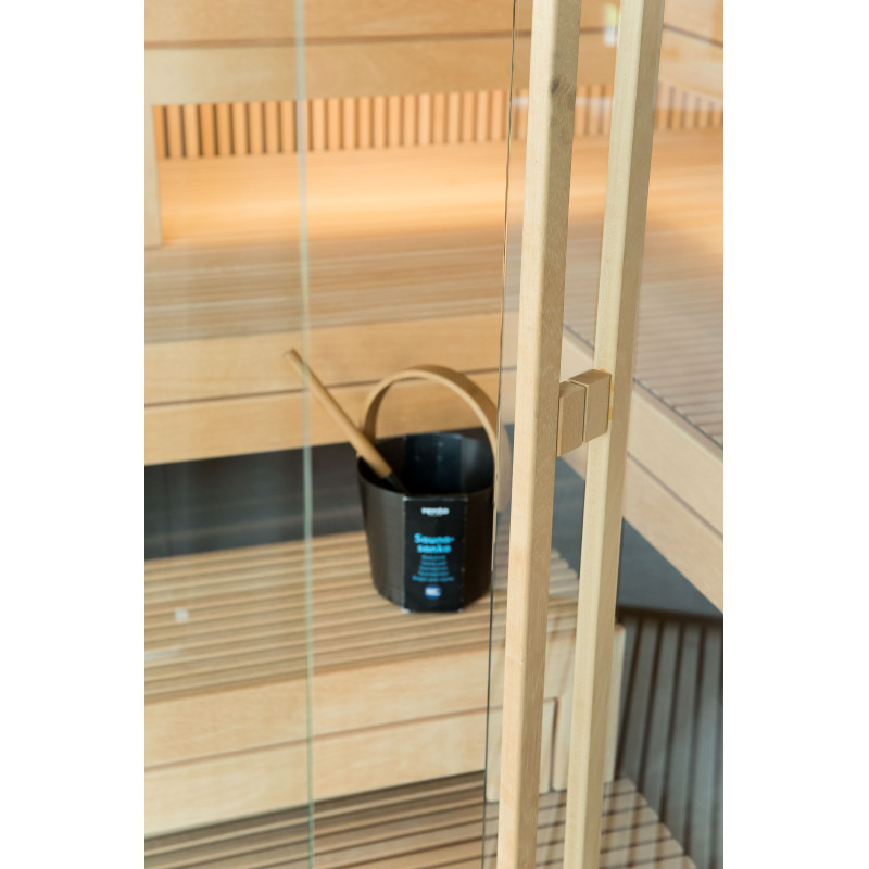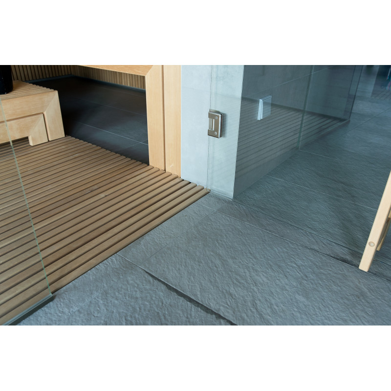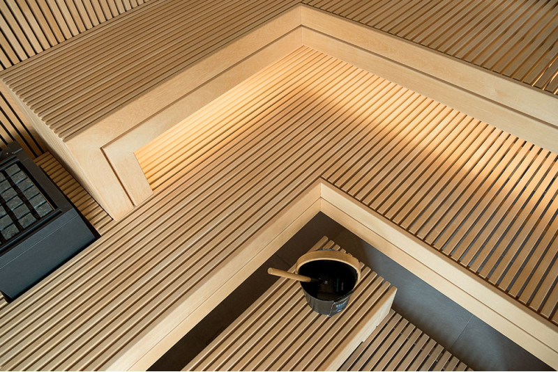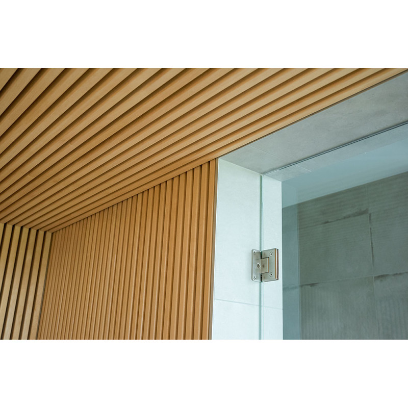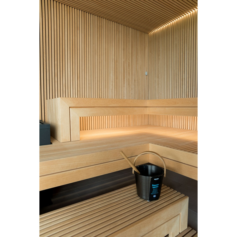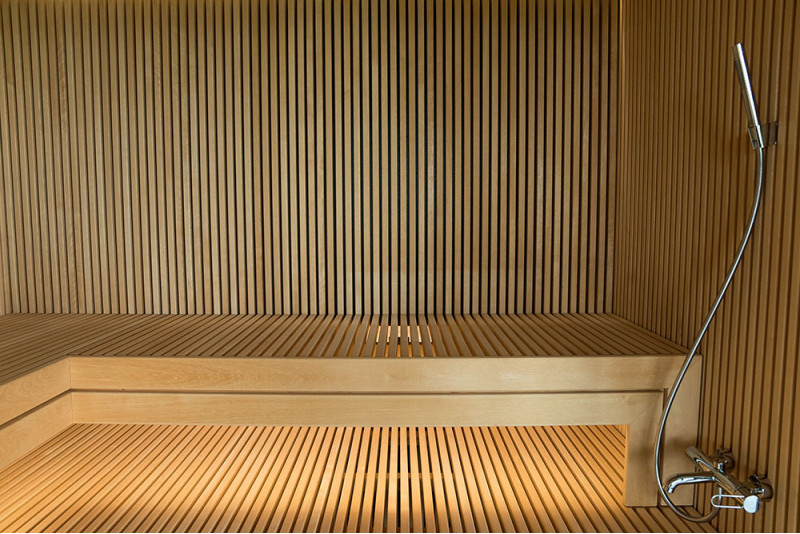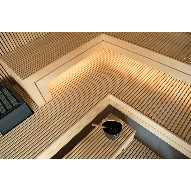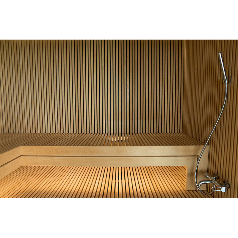 La madera muy clara elegida es abachi. Suave y a fuego lento. Esta característica positiva le permite disfrutar de los placeres de la sauna con comodidad. La iluminación de fibra óptica enfatiza la estructura de la madera. La iluminación equipada debajo de las tumbonas y el techo serpentea horizontalmente por toda la pared e ilumina cómodamente las tiras de madera caladas.