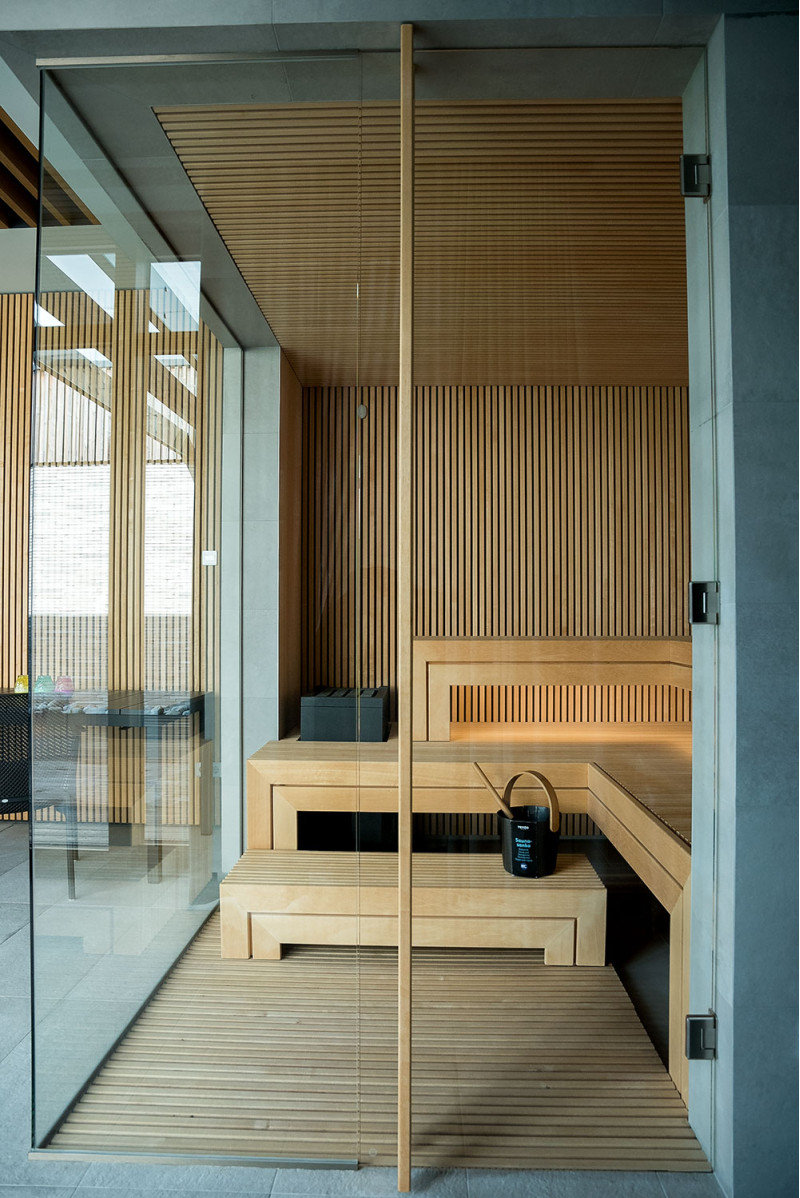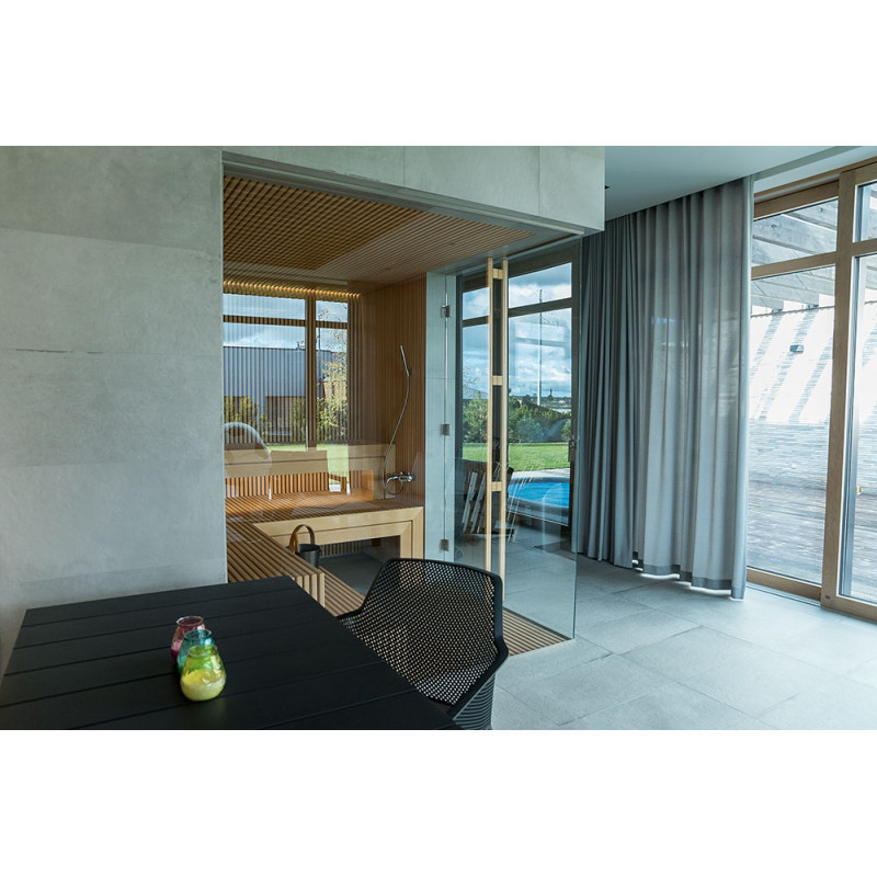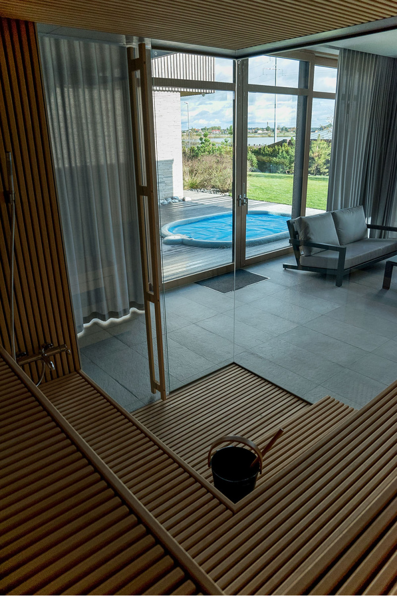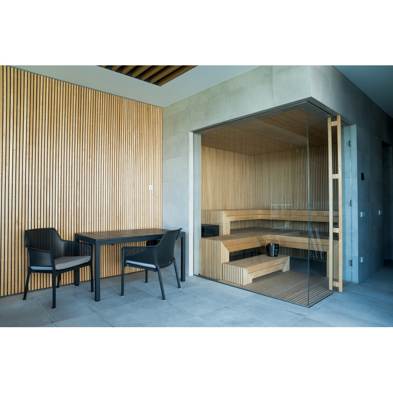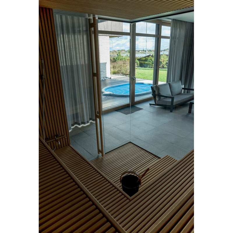 El diseño exclusivo de esta sauna se crea decorando con bruselas de madera calada. También se utilizaron motivos repetitivos de madera en la sauna. Se ha creado un espacio limpio y armonioso, no está dividido por una vitrina de vidrio de sauna, sino por el contrario, se expande y abre la vista a la maravillosa naturaleza.