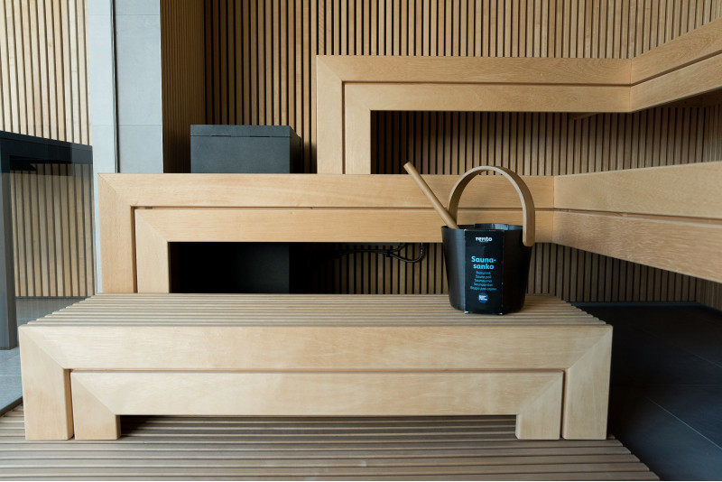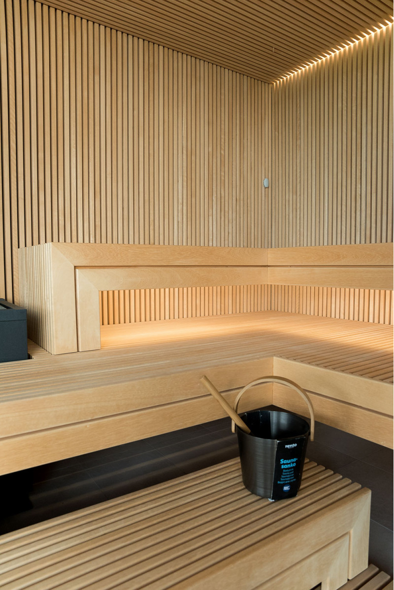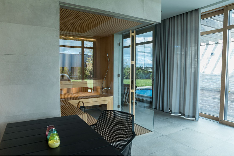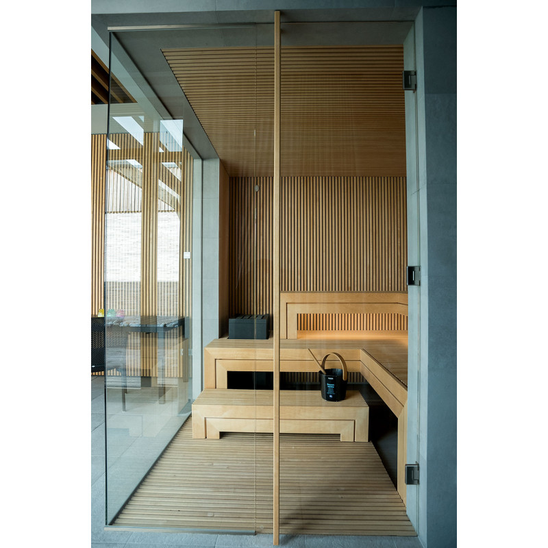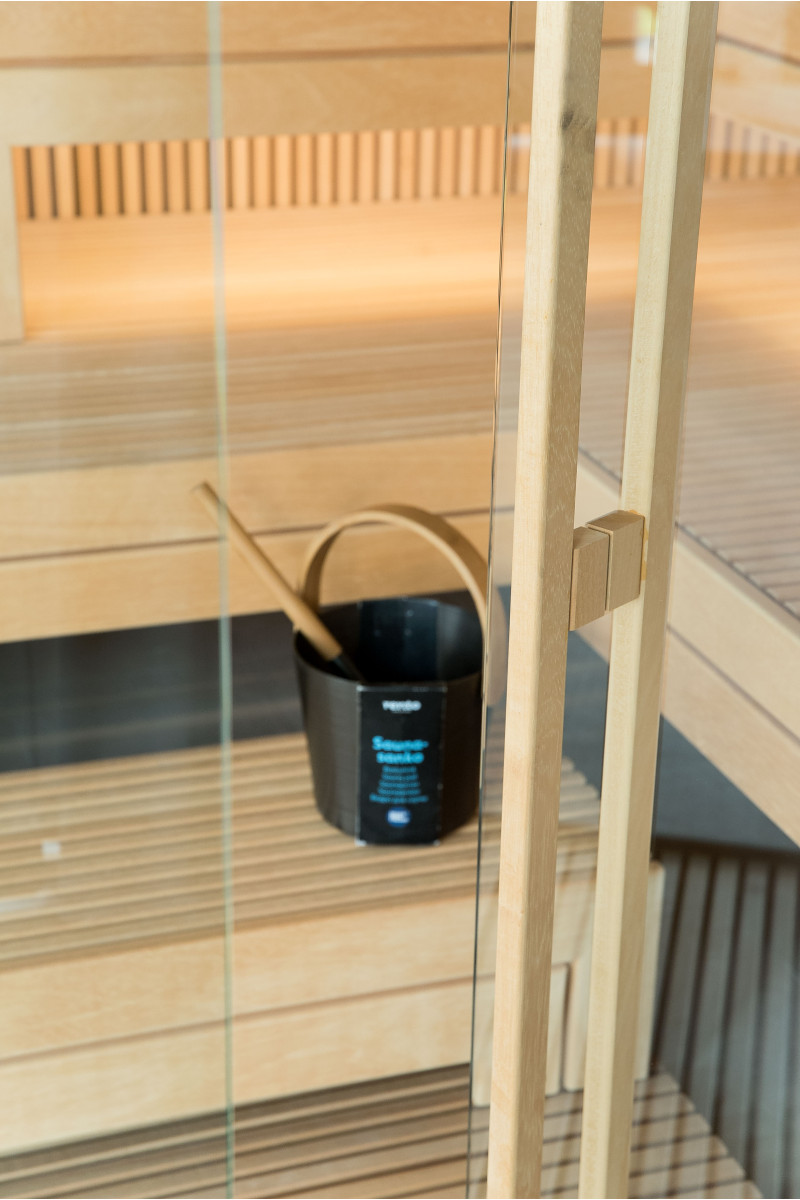 El diseño exclusivo de esta sauna se crea decorando con bruselas de madera calada. También se utilizaron motivos repetitivos de madera en la sauna. Se ha creado un espacio limpio y armonioso, no está dividido por una vitrina de vidrio de sauna, sino por el contrario, se expande y abre la vista a la maravillosa naturaleza.