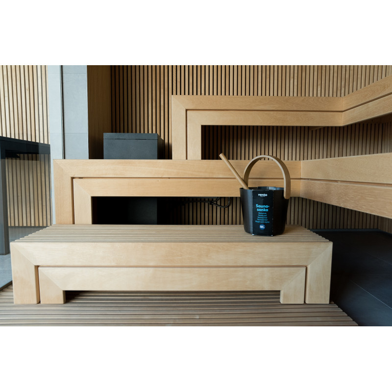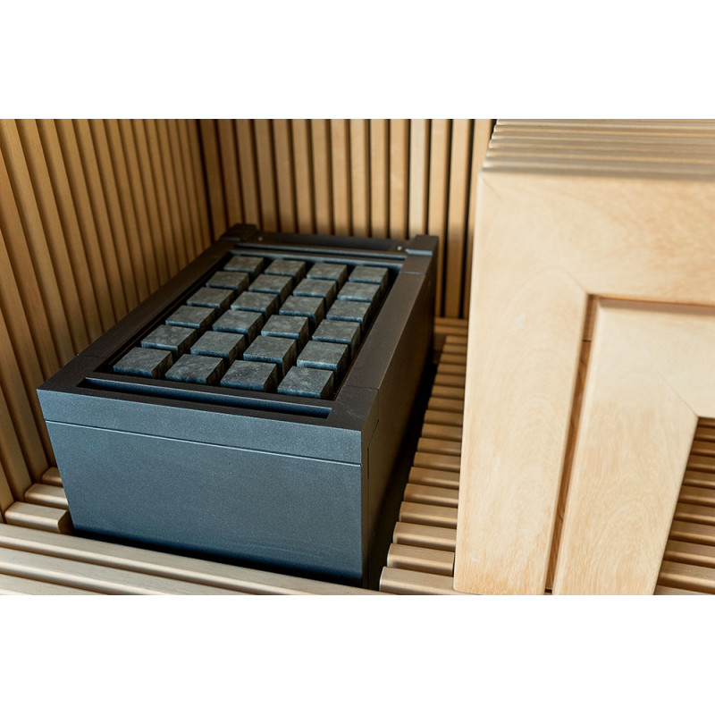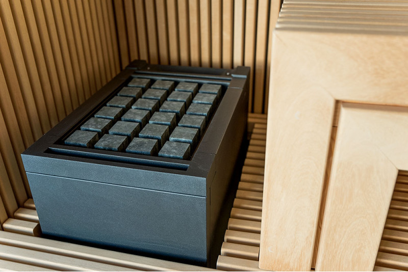 - El calentador tiene piedras únicas en forma de cubo, pero además estaba equipado con piedras de jadeíta (40 kg), para mantener la temperatura constante y disfrutar cómodamente de la sauna.