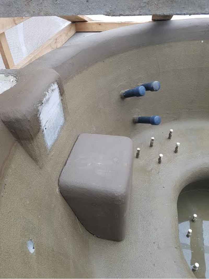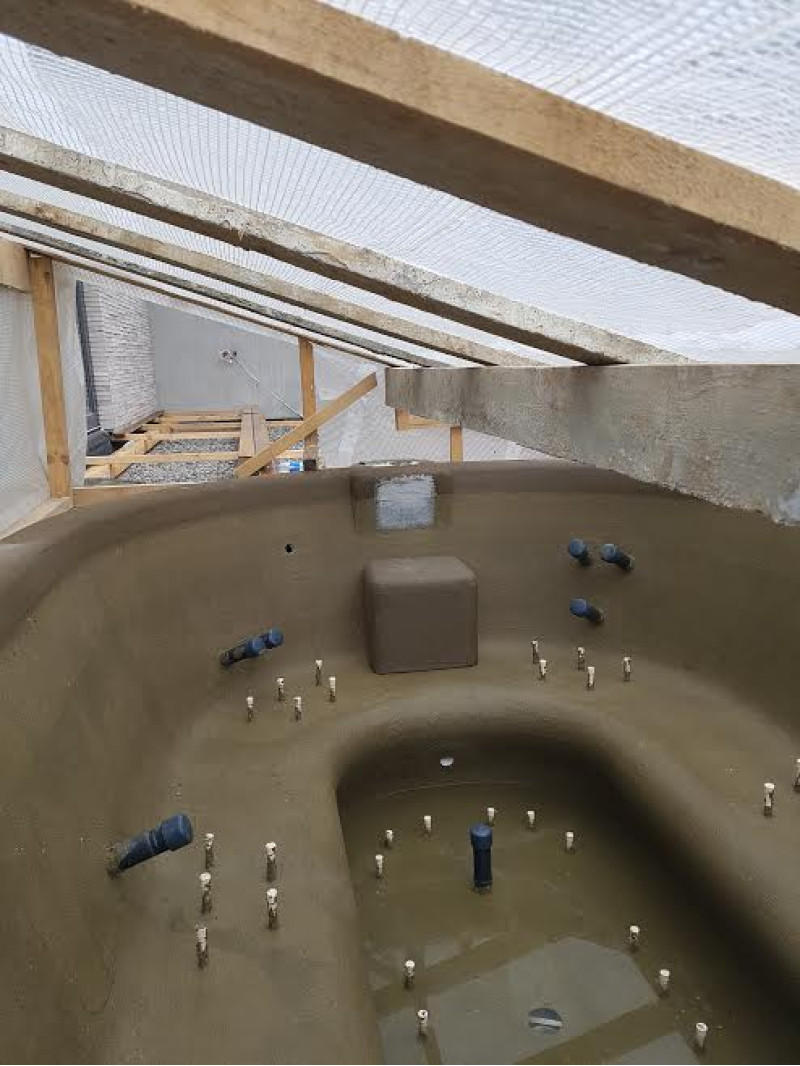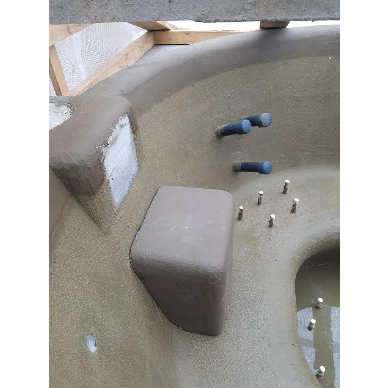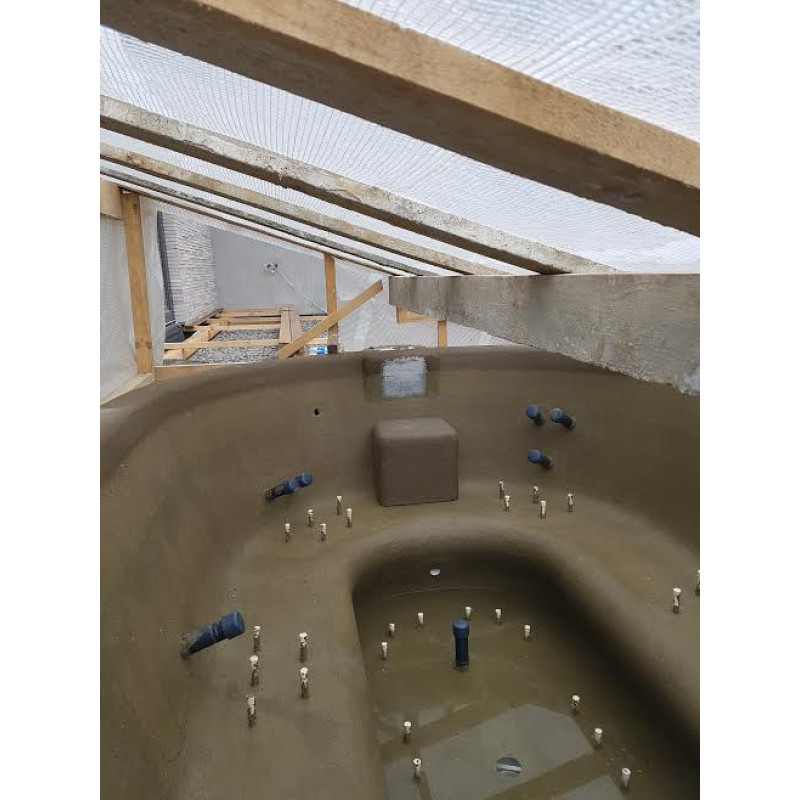 Los moldes para piscinas están hechos de poliestireno extruido especial, según pedido individual. El interior está cubierto con mosaicos de vidrio triturado.
