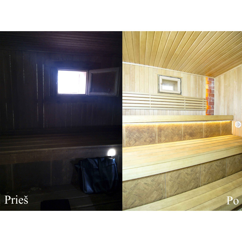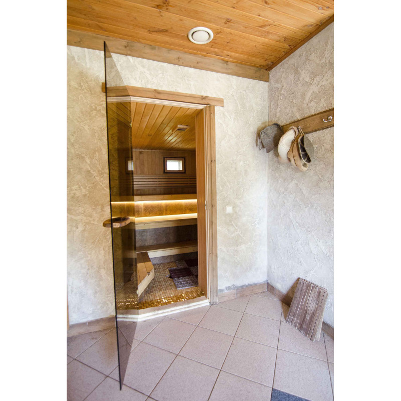 Ventana reemplazada - marco de madera, vidrio templado. Las puertas de sauna gastadas se han reemplazado por otras nuevas, especialmente diseñadas para saunas con vidrio templado y marco de madera. Este vidrio está tratado térmicamente, 5 veces más fuerte de lo normal. El marco está hecho de madera especialmente preparada para evitar la deformación del marco debido a las temperaturas fluctuantes.