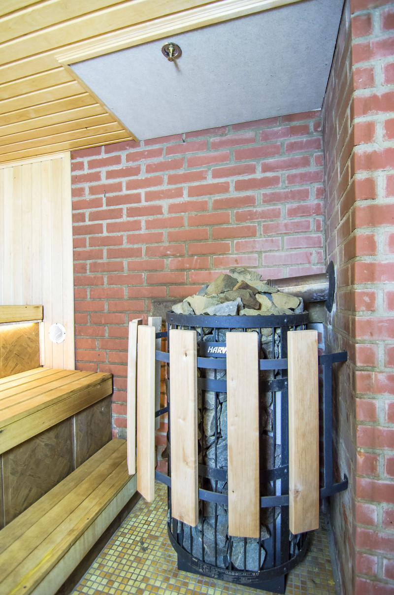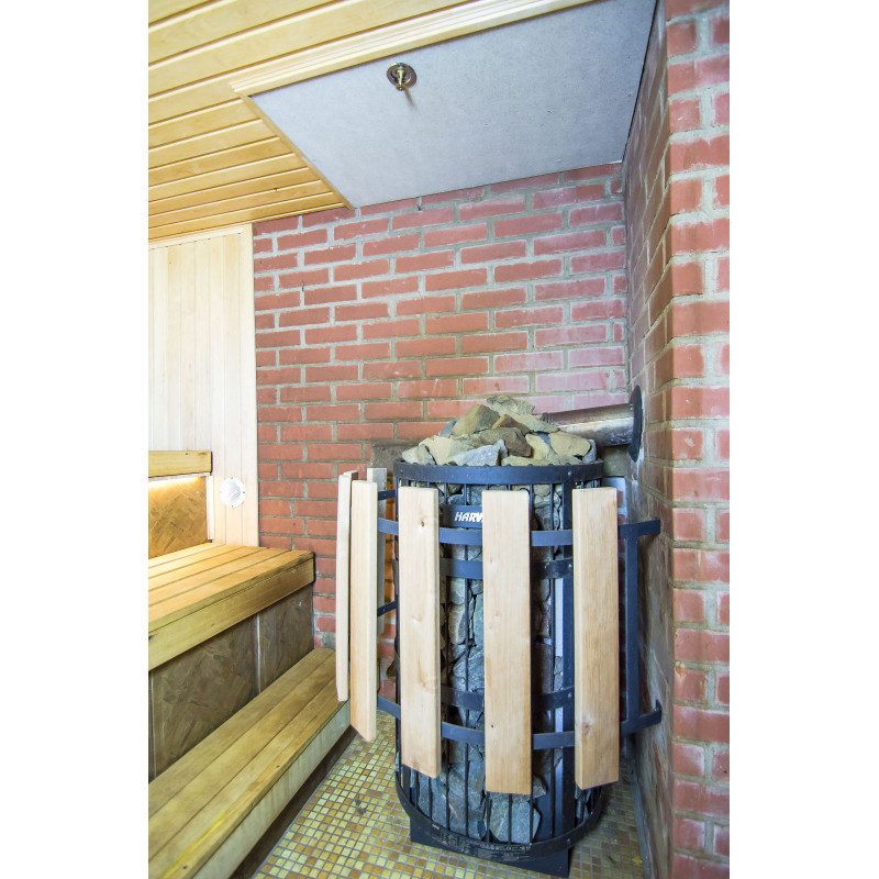 Se cambió el equipo de calefacción de la sauna. El calentador artesanal se ha transformado en un Harvia Legend 300 Duo de leña con una cámara de combustión externa que contiene una gran cantidad de piedras, lo que le permite disfrutar del calor que irradian incluso en ausencia de altas temperaturas. El techo está equipado con un sistema de protección contra incendios: placa Minerit Sauna, rociadores. Un borde protector de madera y metal está instalado alrededor del calentador.