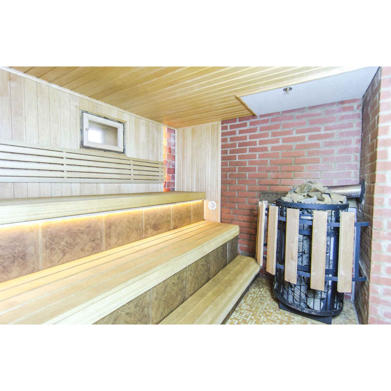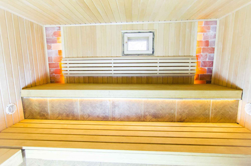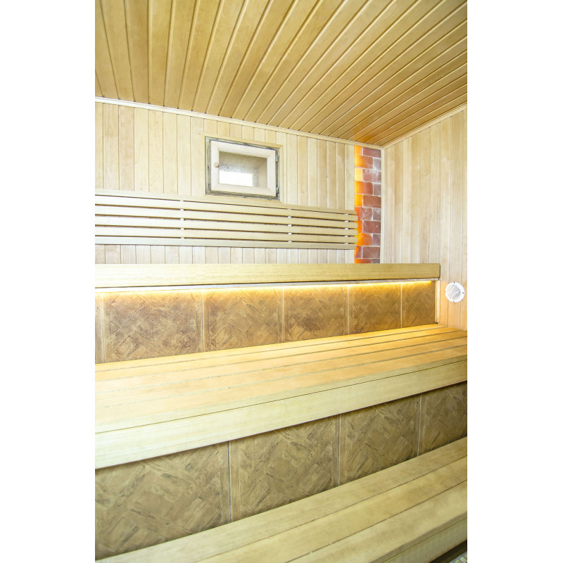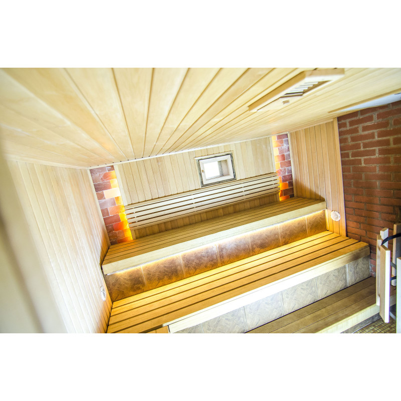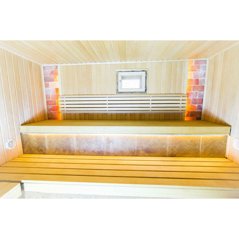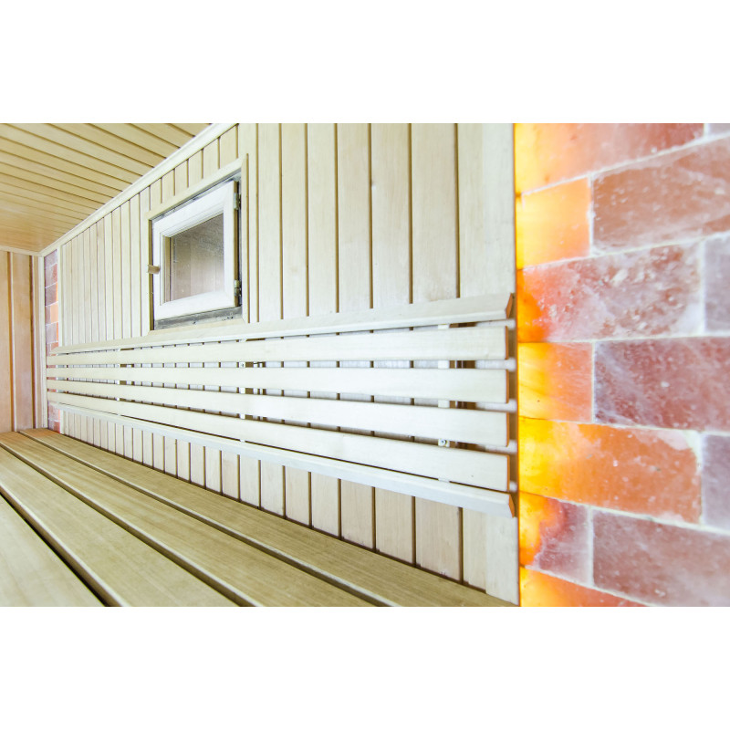 Se eligió un excelente elemento decorativo para la decoración de la sauna: bloques de sal del Himalaya. La sal del Himalaya no solo se ve muy bien, sino que también mejora la calidad del aire interior, reduce los síntomas de alergias y asma, eleva el estado de ánimo y proporciona energía, neutraliza la radiación electromagnética y reduce la electricidad estática en el aire. La iluminación LED incorporada detrás de los bloques de sal crea un ambiente aún más acogedor en la sauna y acentúa el aspecto de los bloques de sal del Himalaya.