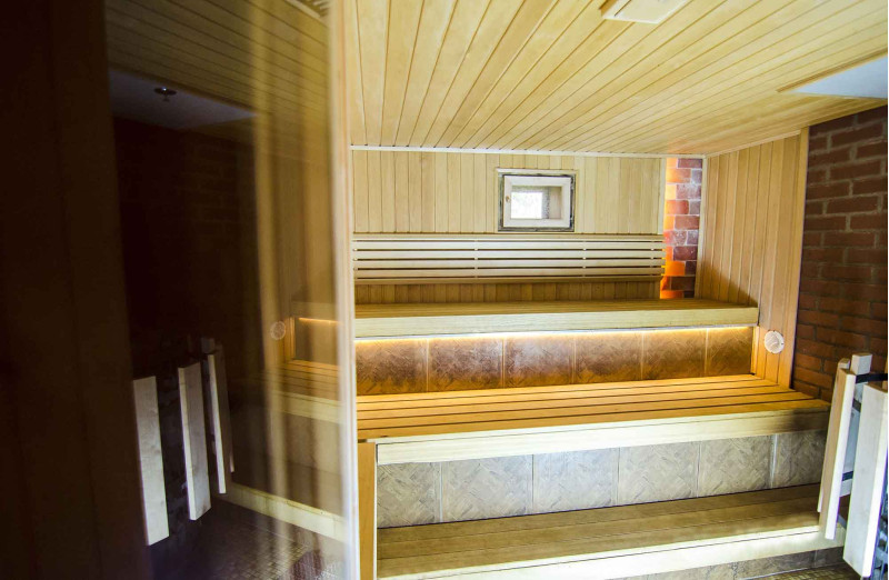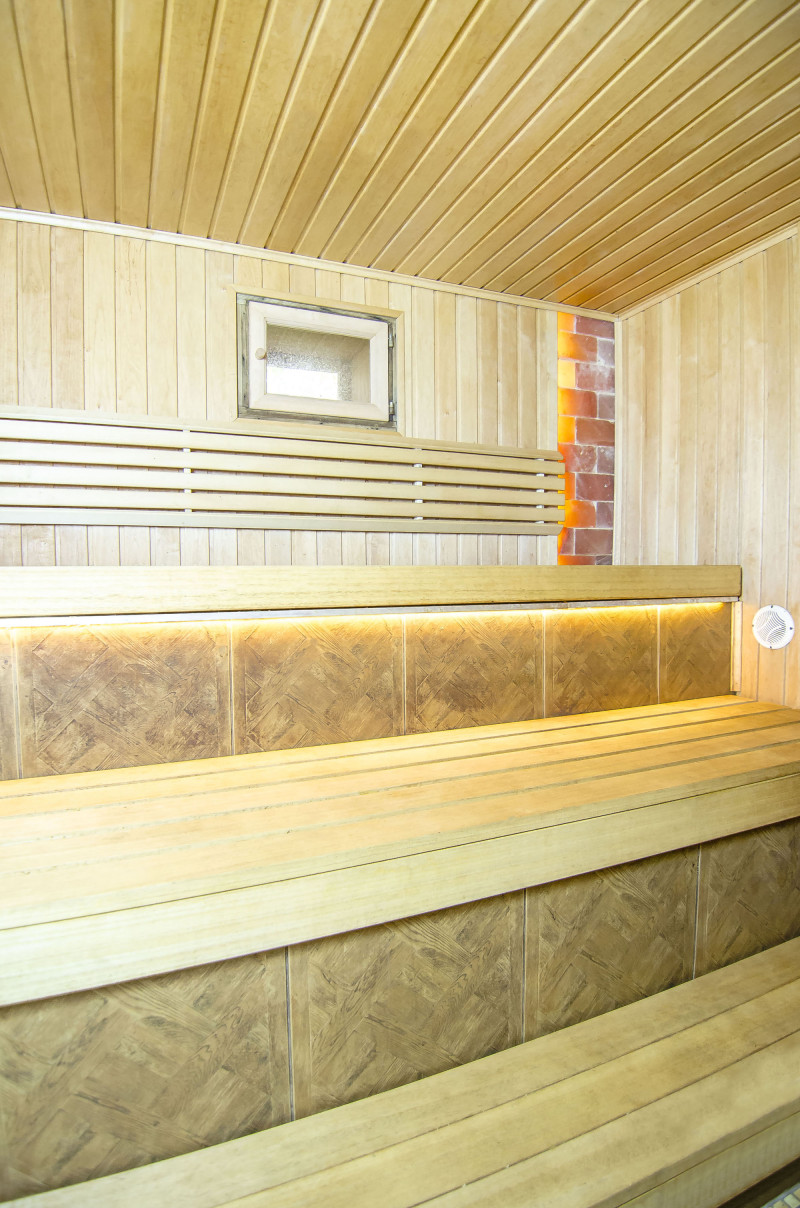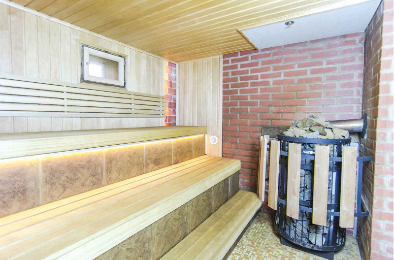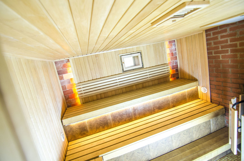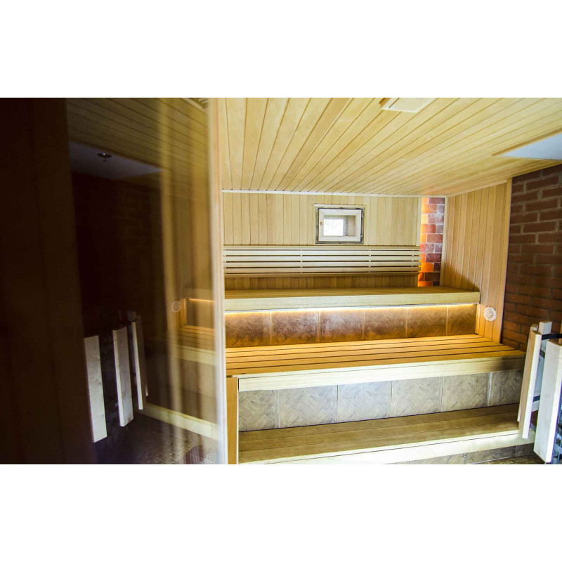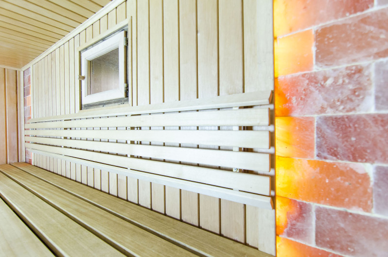 Se eligió un excelente elemento decorativo para la decoración de la sauna: bloques de sal del Himalaya. La sal del Himalaya no solo se ve muy bien, sino que también mejora la calidad del aire interior, reduce los síntomas de alergias y asma, eleva el estado de ánimo y proporciona energía, neutraliza la radiación electromagnética y reduce la electricidad estática en el aire. La iluminación LED incorporada detrás de los bloques de sal crea un ambiente aún más acogedor en la sauna y acentúa el aspecto de los bloques de sal del Himalaya.