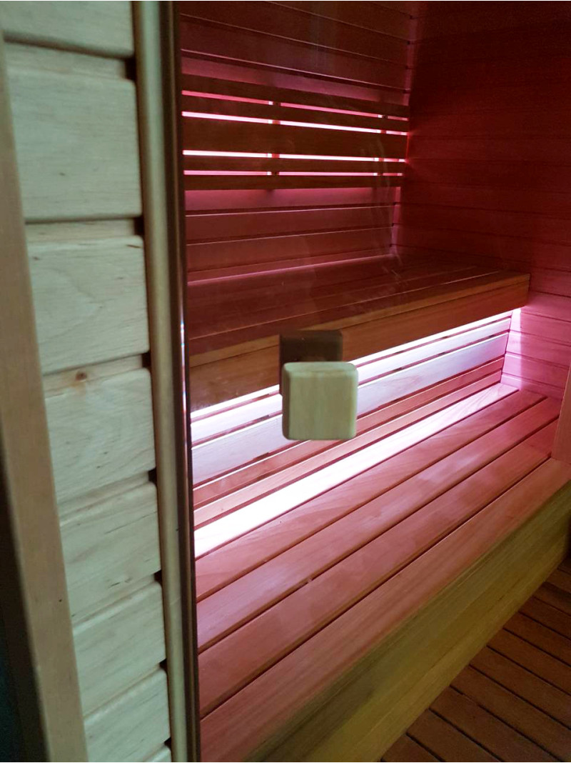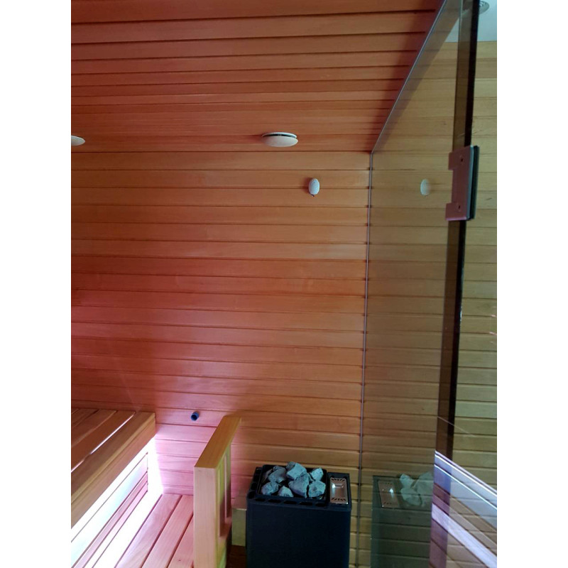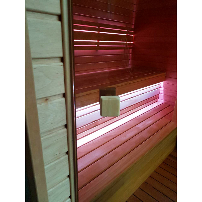 La iluminación de la sauna es un detalle muy importante que da un efecto medio relajante en la sauna. Debajo de los bancos y respaldos, hay iluminación de color LED RGB, que puede cambiar de color cuando lo desee. La sauna también está equipada con un sistema de iluminación blanca de fibra óptica "Moon".