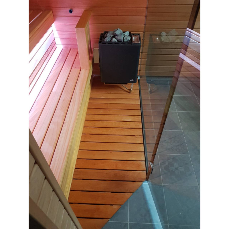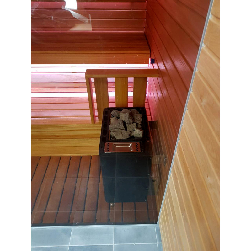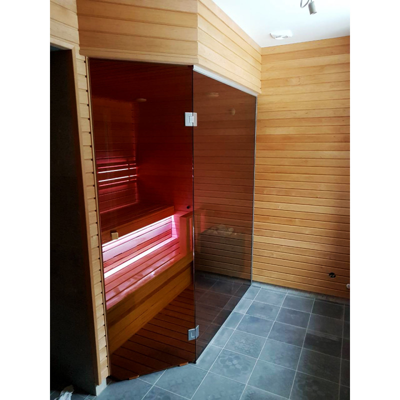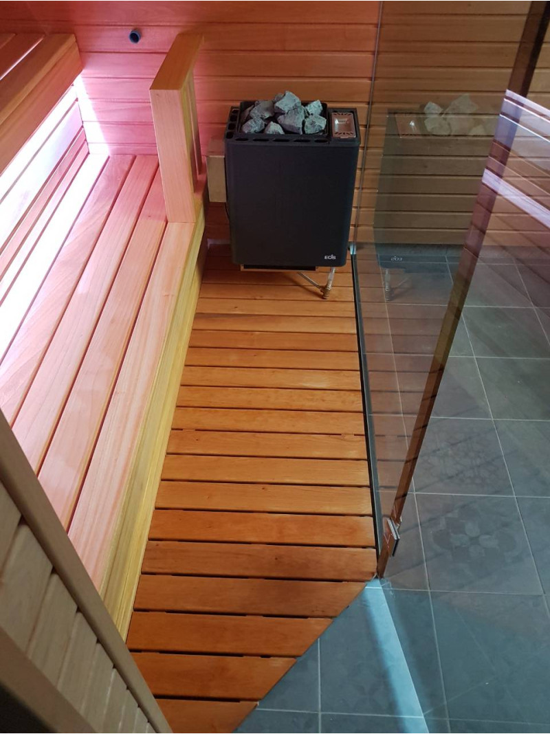 En lugar de puertas y paredes tradicionales, esta sauna combinada tiene una vitrina de aspecto moderno hecha de vidrio tintado templado. Esta vitrina es moderna y proporciona una sensación de espacio.