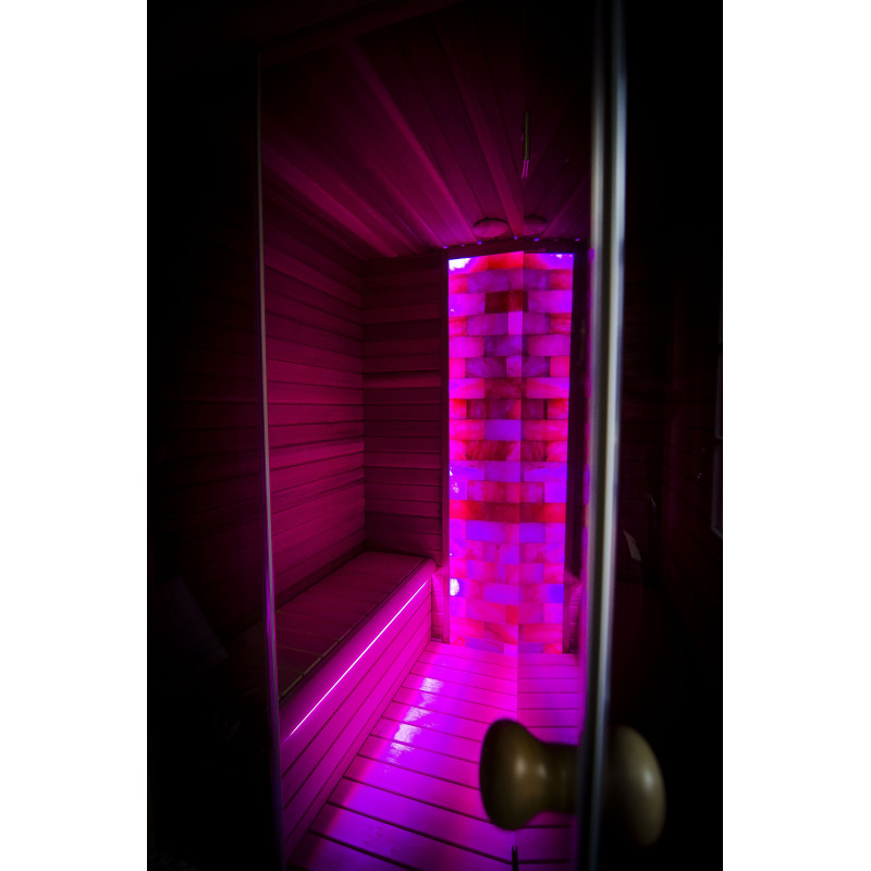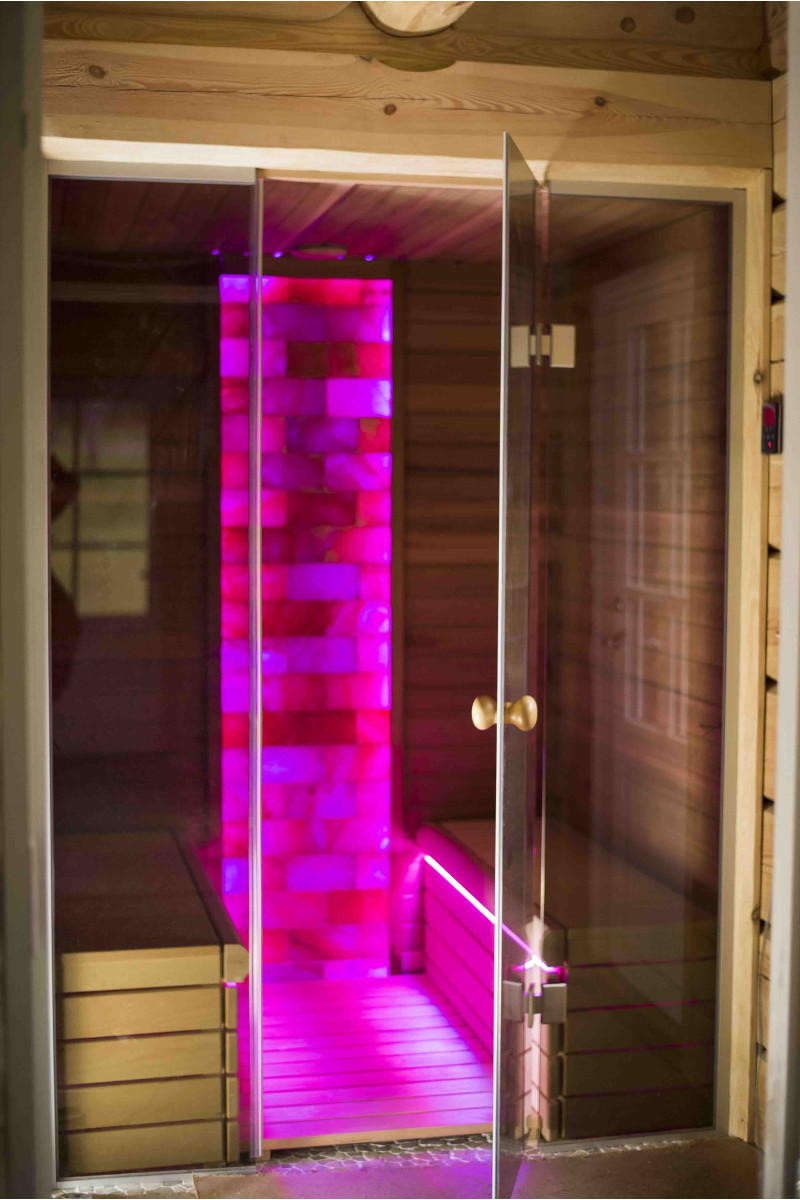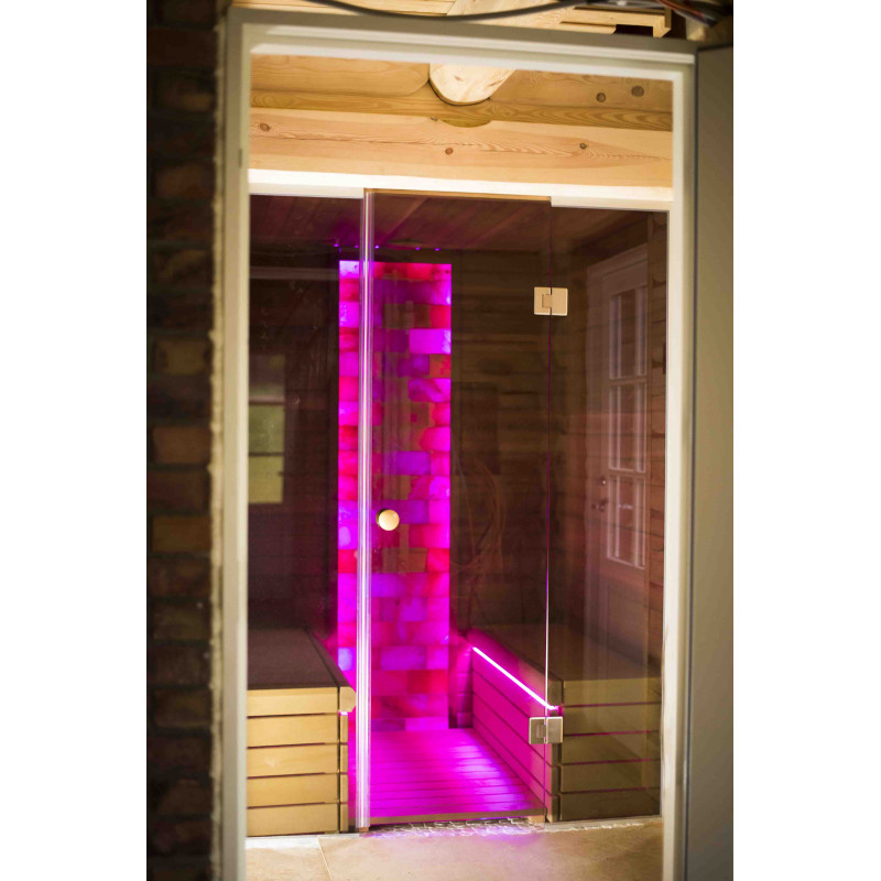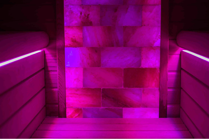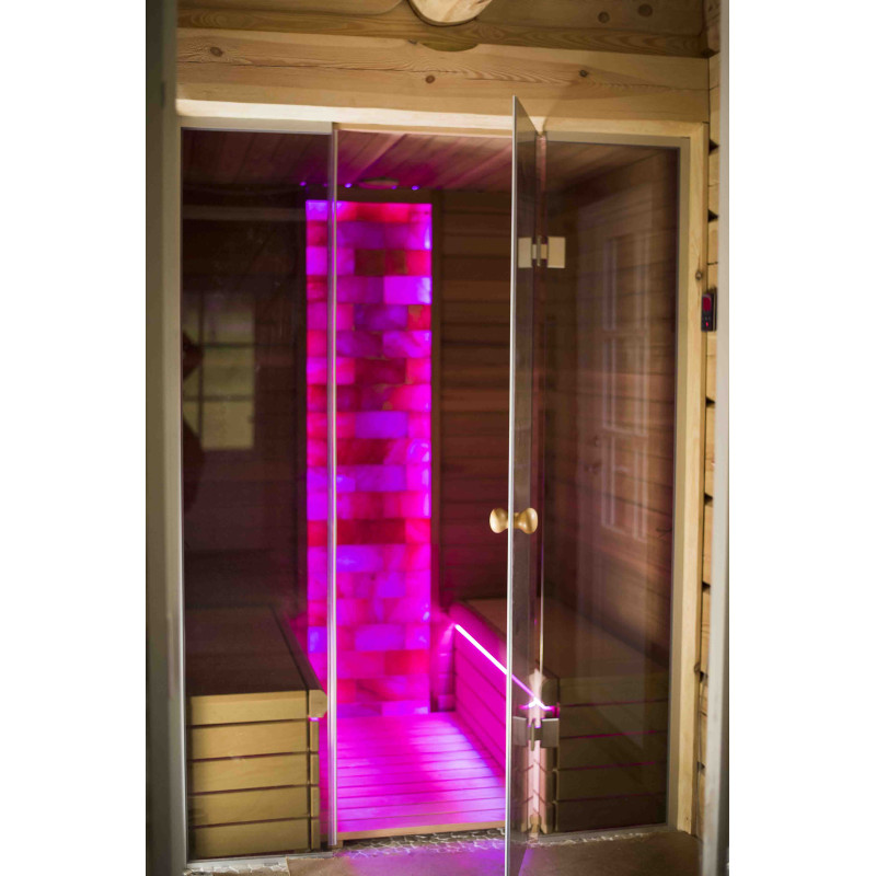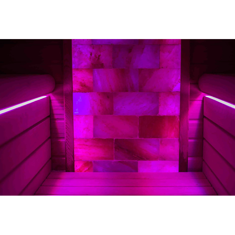 La pared de ladrillos de sal del Himalaya elegida para la decoración de la sauna con la iluminación RGB de colores incorporada, controlada por un cambiador de color inalámbrico, crea un ambiente acogedor y mejora aún más el efecto de la sauna.