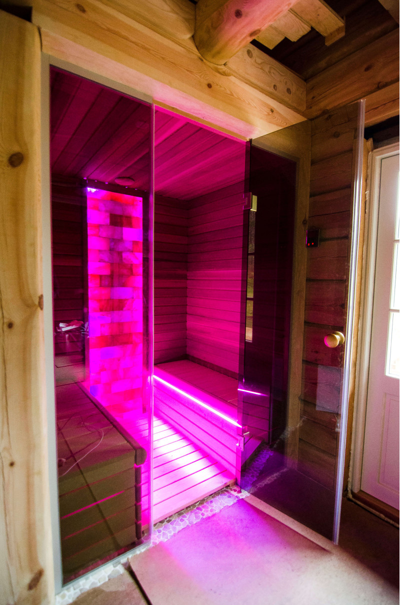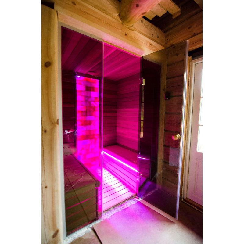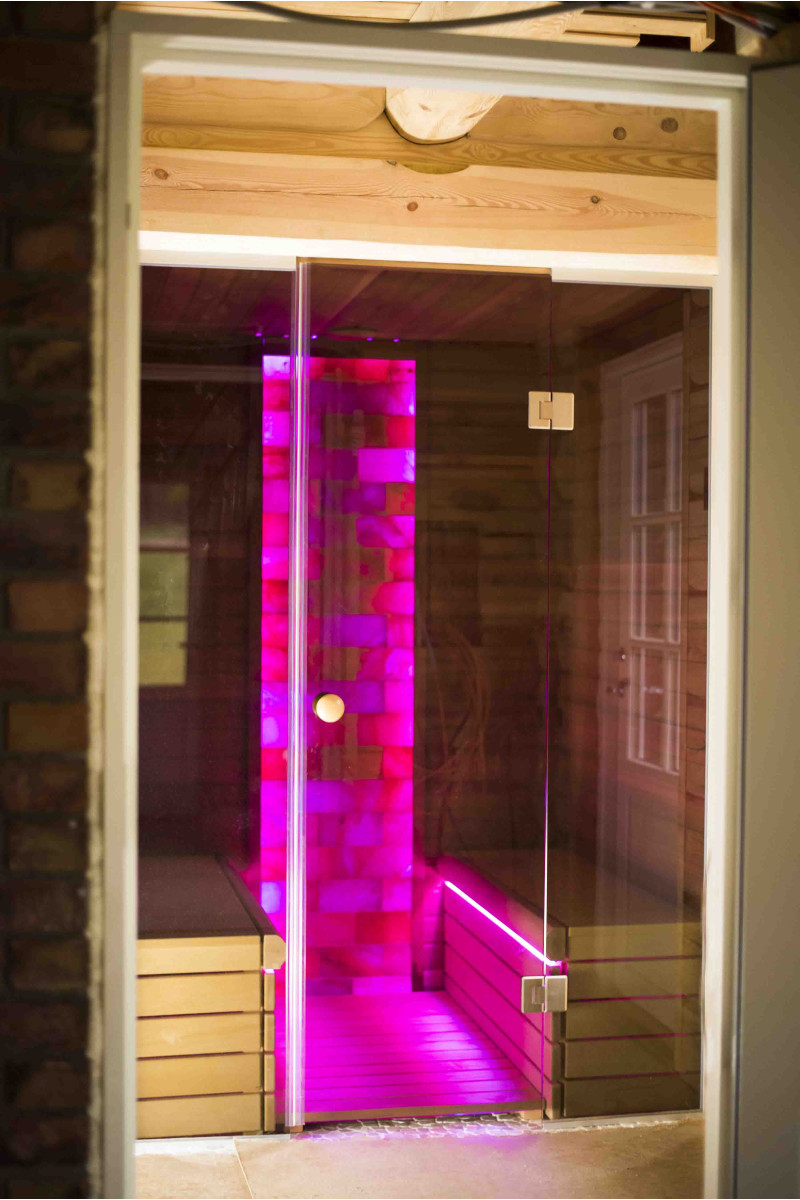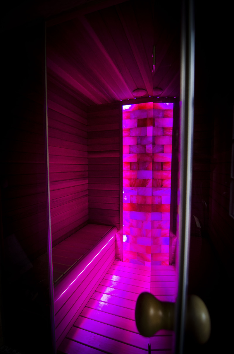 La pared de ladrillos de sal del Himalaya elegida para la decoración de la sauna con la iluminación RGB de colores incorporada, controlada por un cambiador de color inalámbrico, crea un ambiente acogedor y mejora aún más el efecto de la sauna.