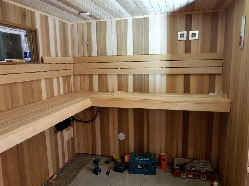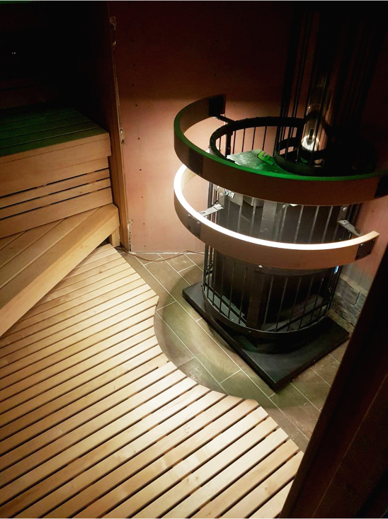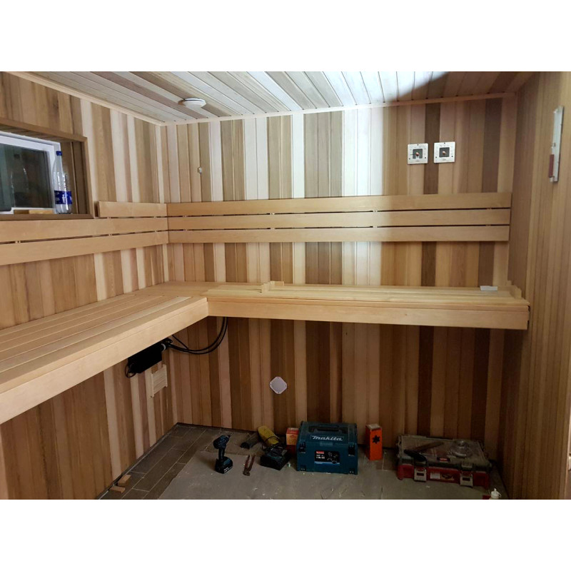 Debido a la alta durabilidad de la sauna, se eligió madera de aliso y cedro canadiense. La madera de cedro tiende a absorber la menor cantidad de calor, lo que le da más comodidad a la sauna.