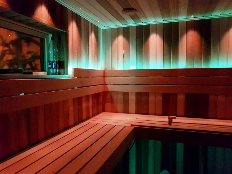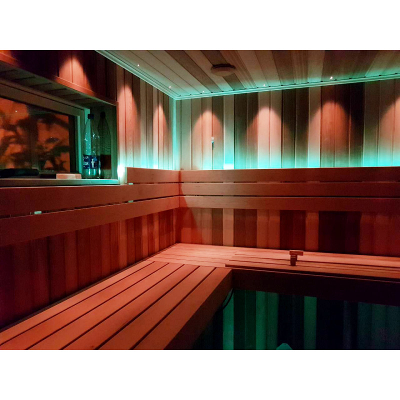 Para una iluminación elegante de la sauna: proyector de iluminación de fibra óptica Cariitti, lámparas debajo de los respaldos y bancos y termómetros iluminados. Las luminarias pueden cambiar de color, según sus deseos y estado de ánimo.