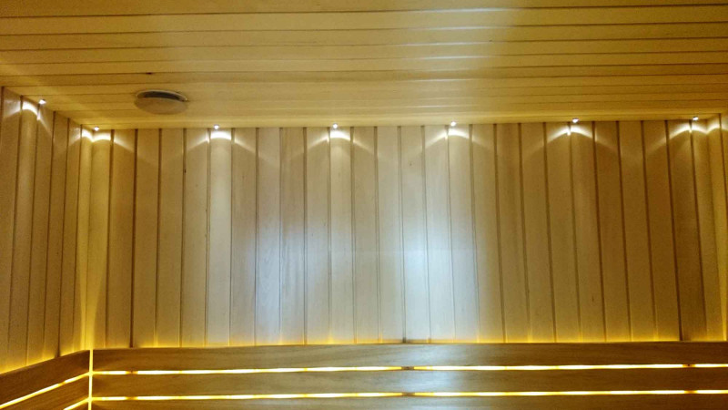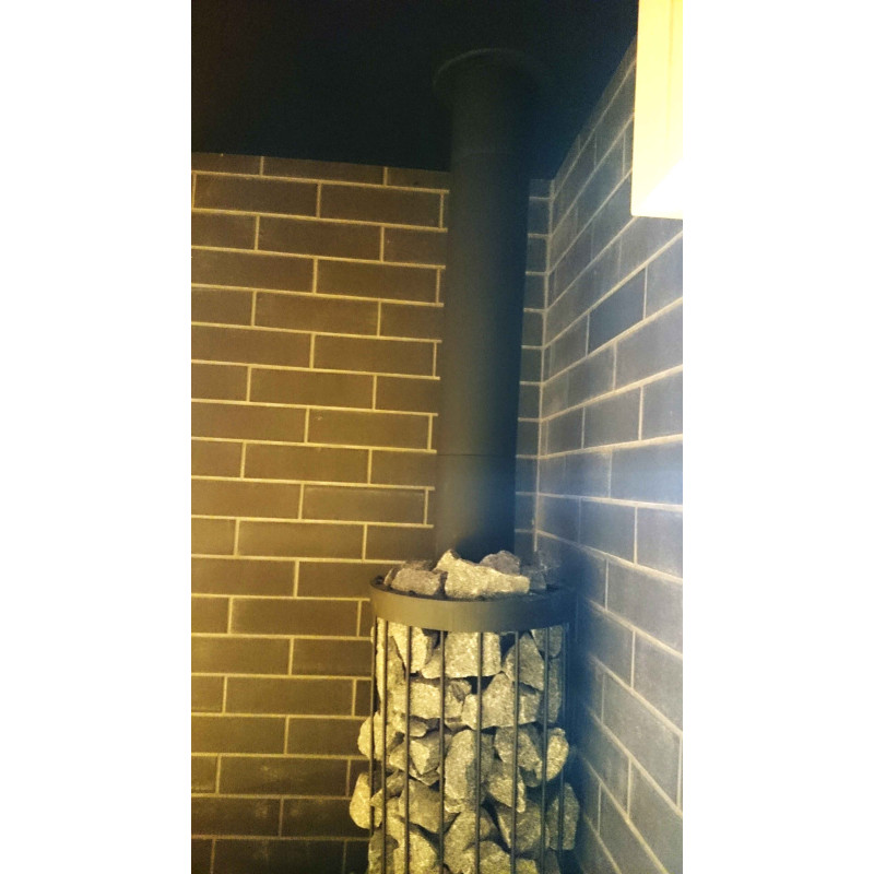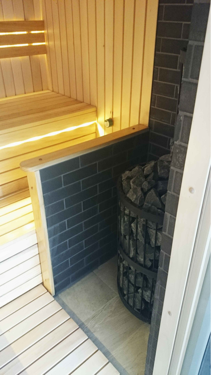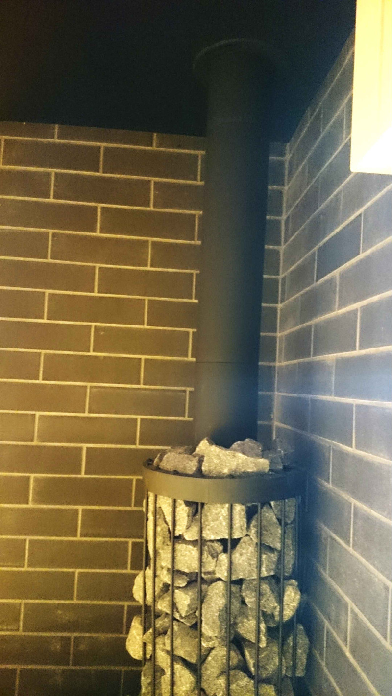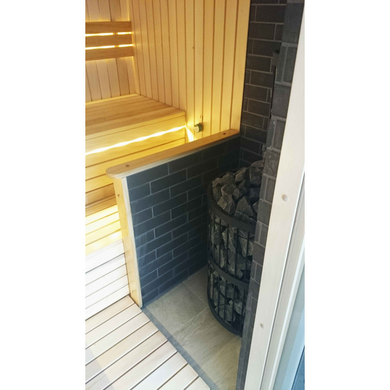 Este proyecto de sauna con una pared protectora para el calentador. La pared está hecha de una placa resistente al calor Minerit, sobre un marco de metal.
